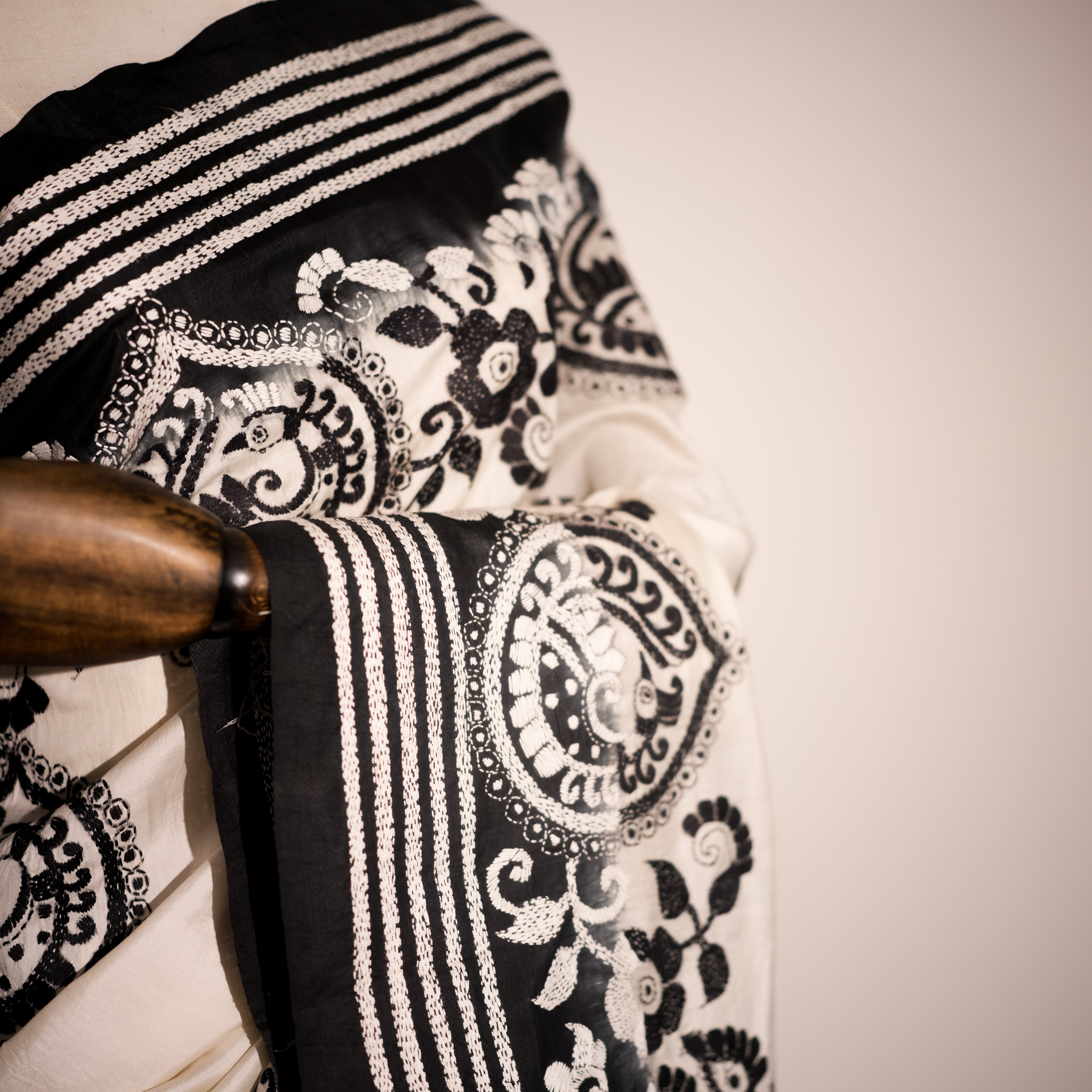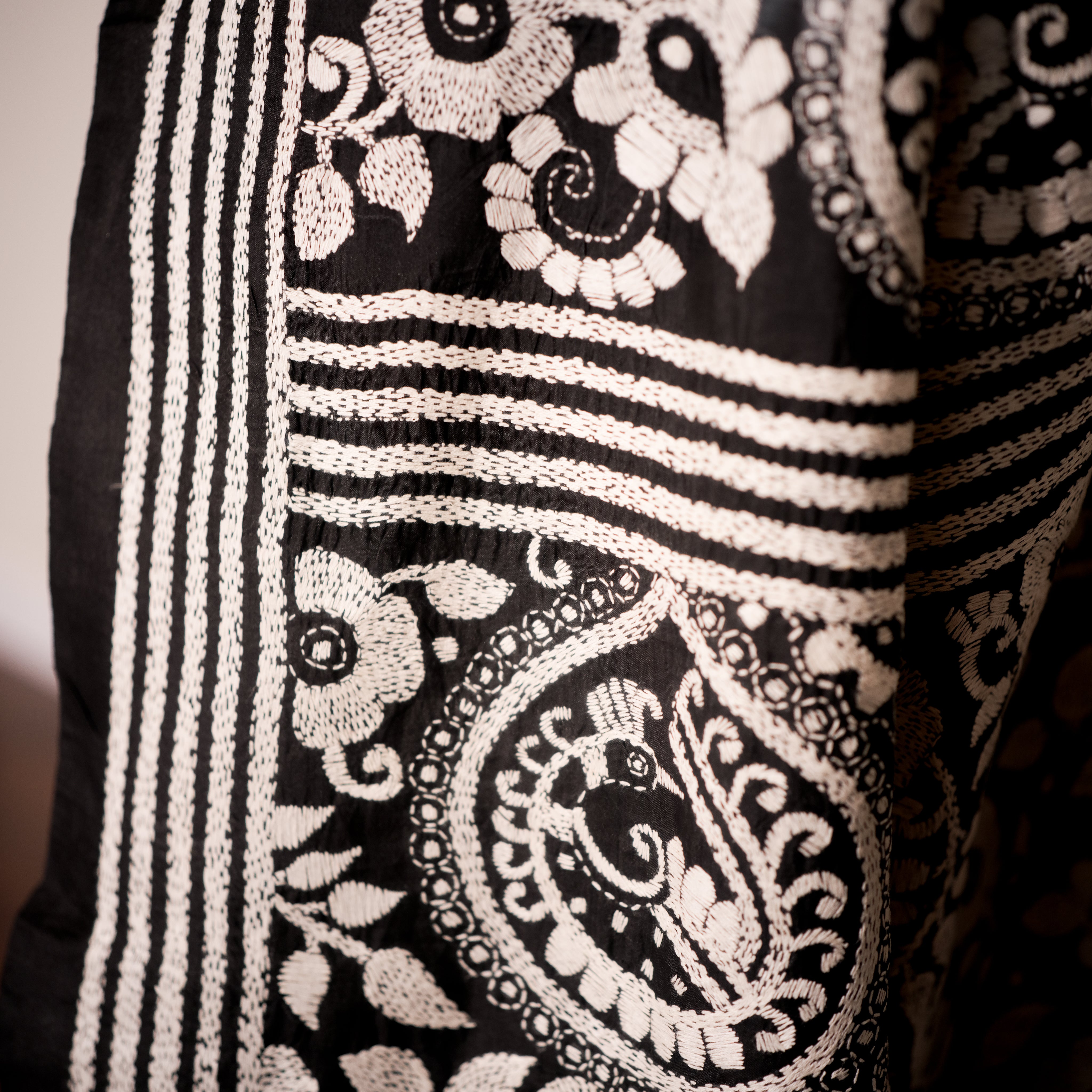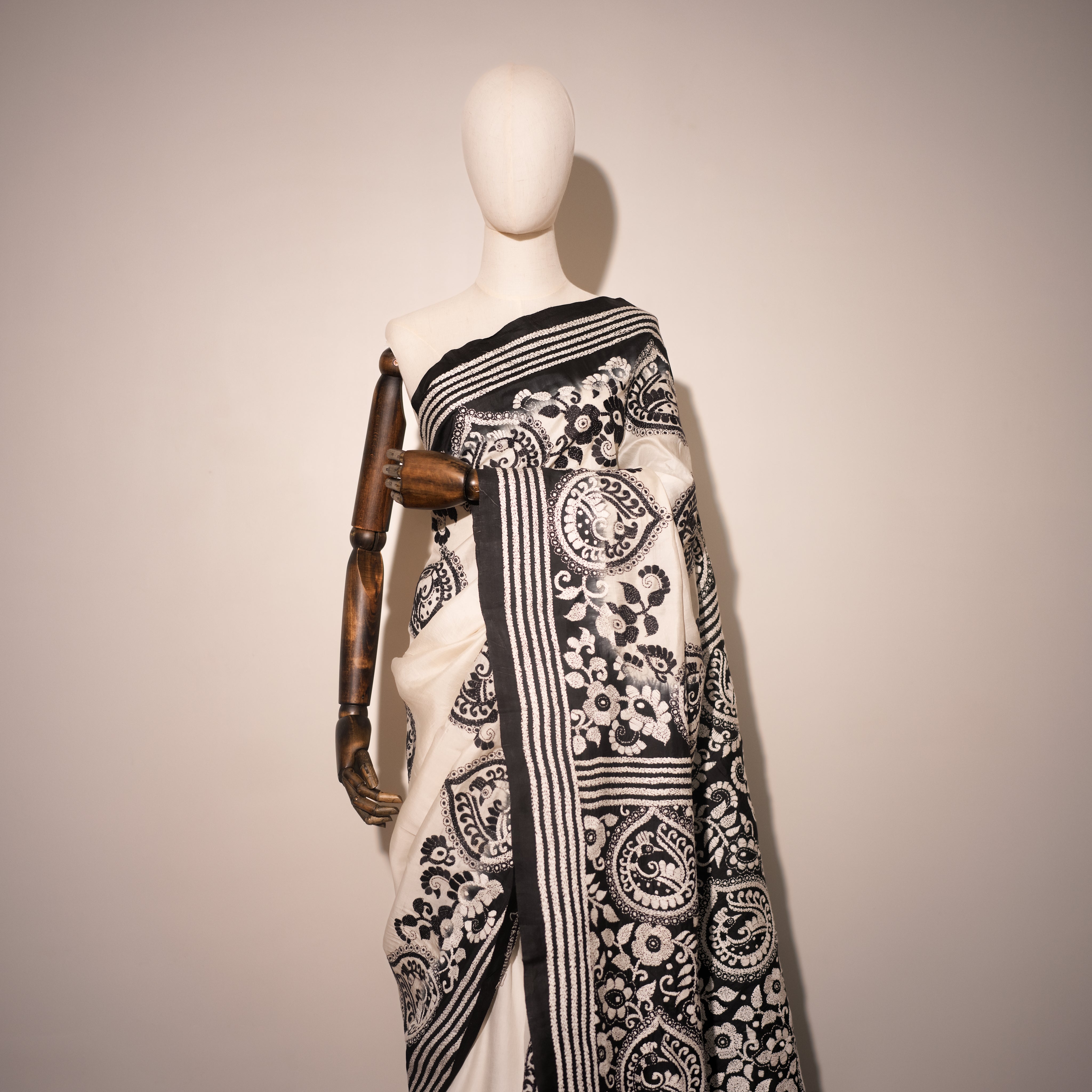 Monochrome Elegance – Hand Kanthha on Bangalore Silk
