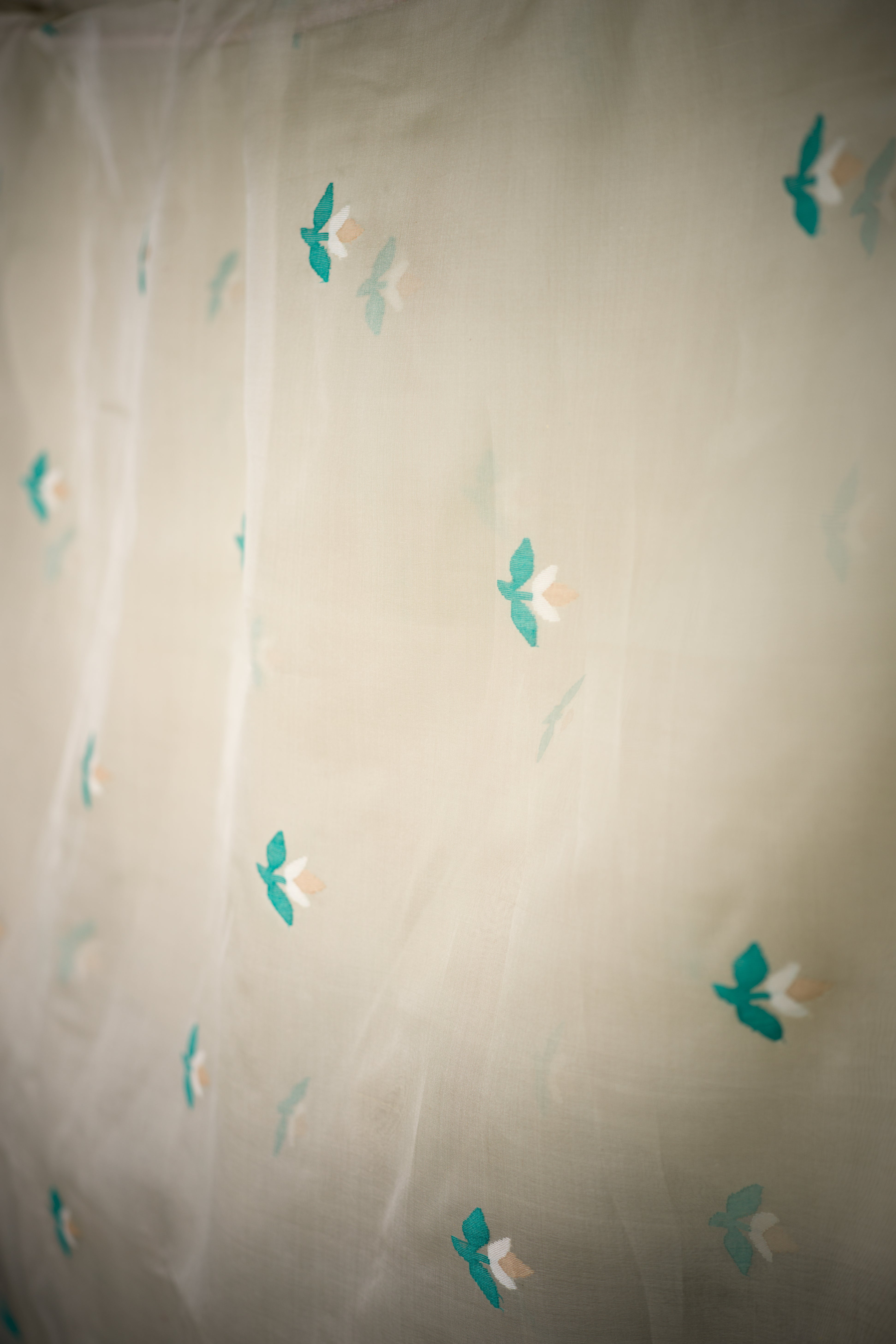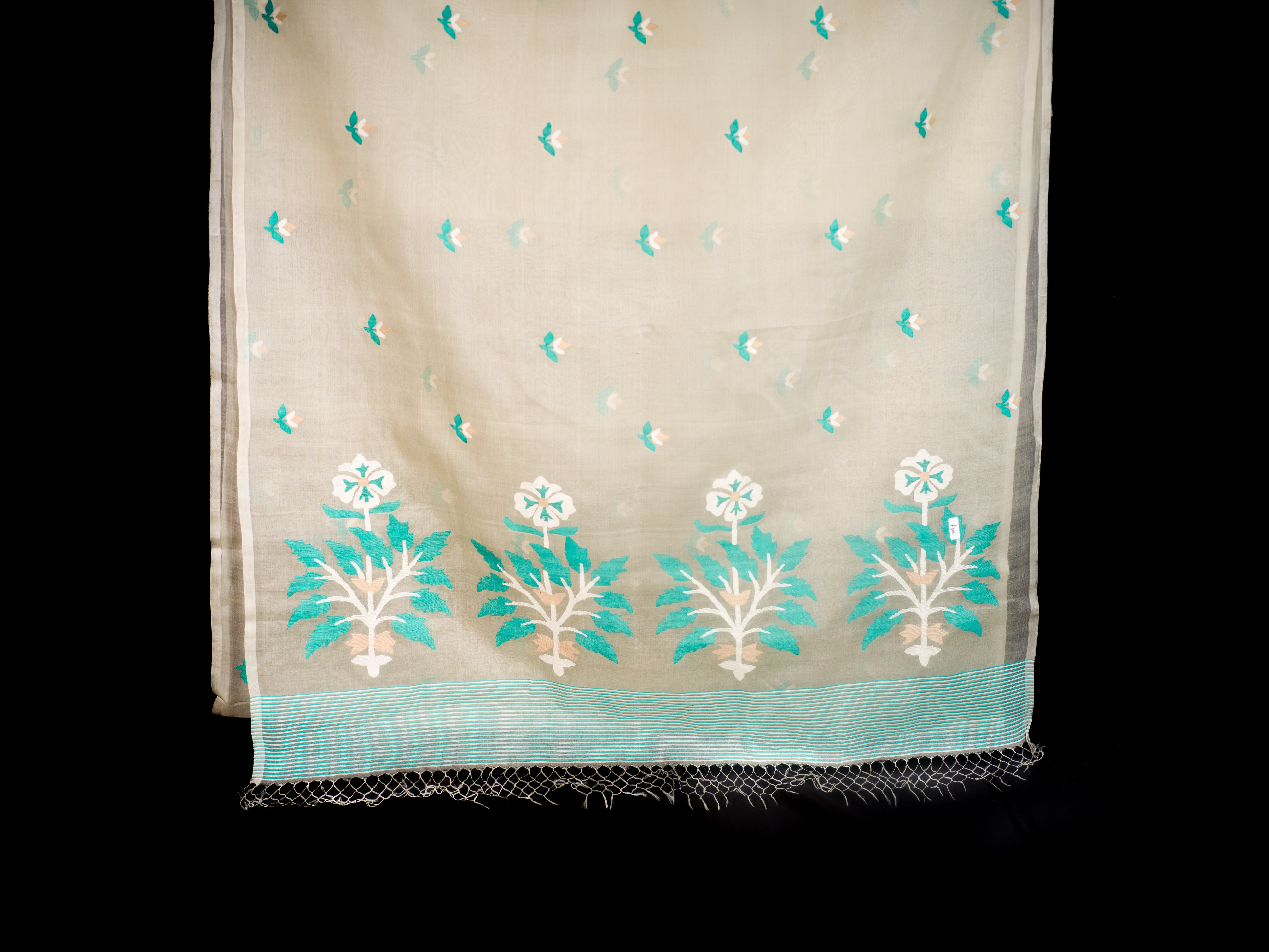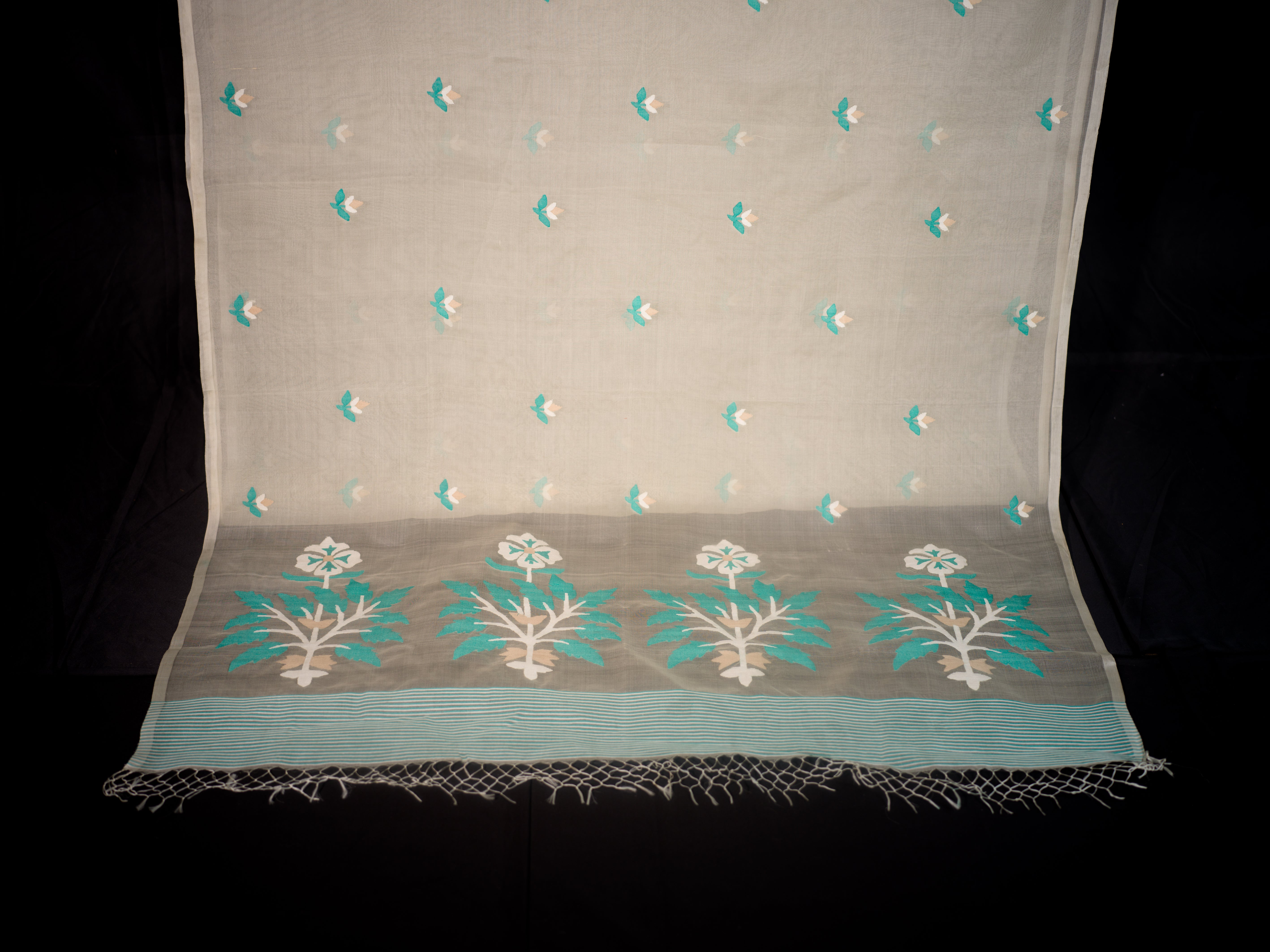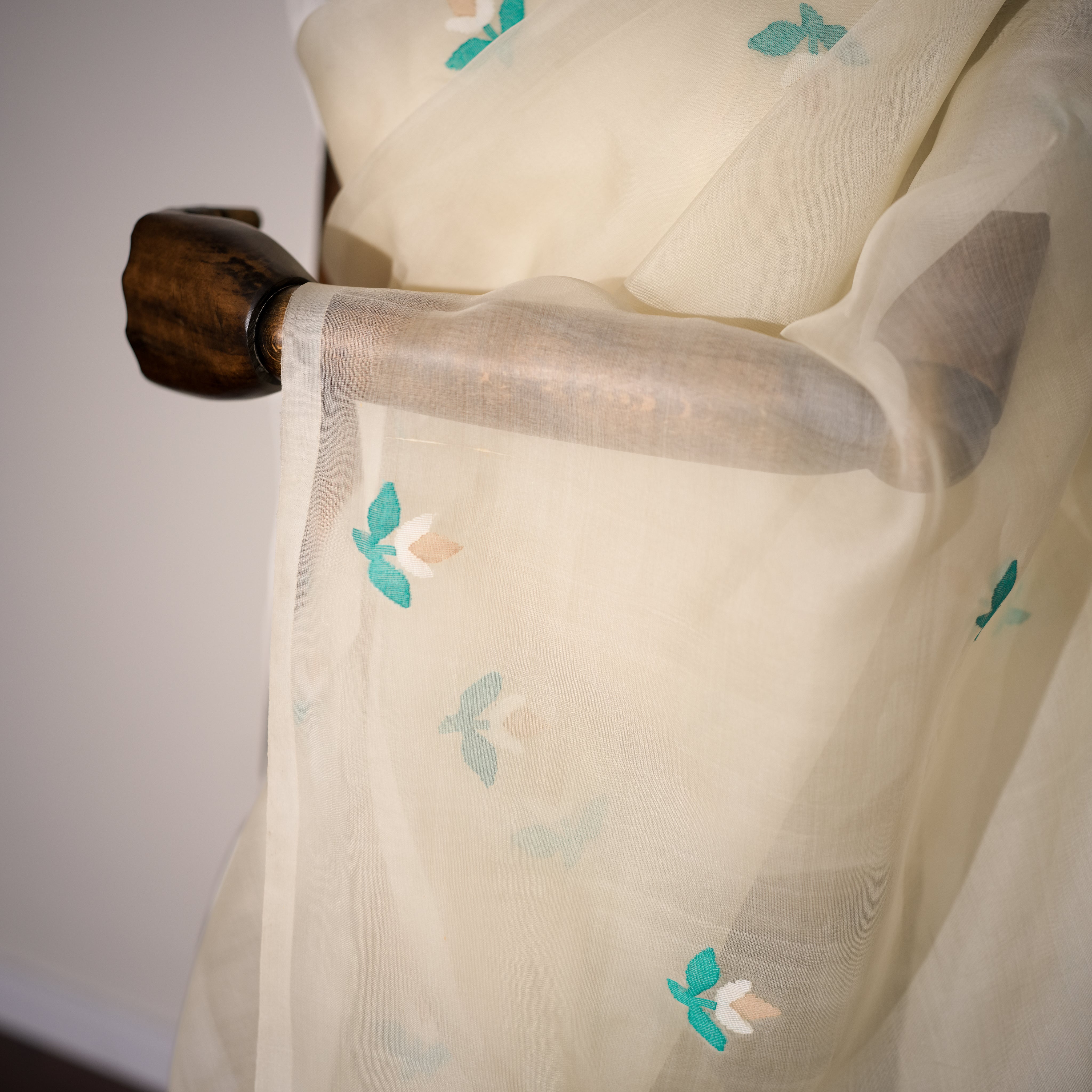 Ivory Jamdaani Saree with Aqua Blue and White Floral Motifs