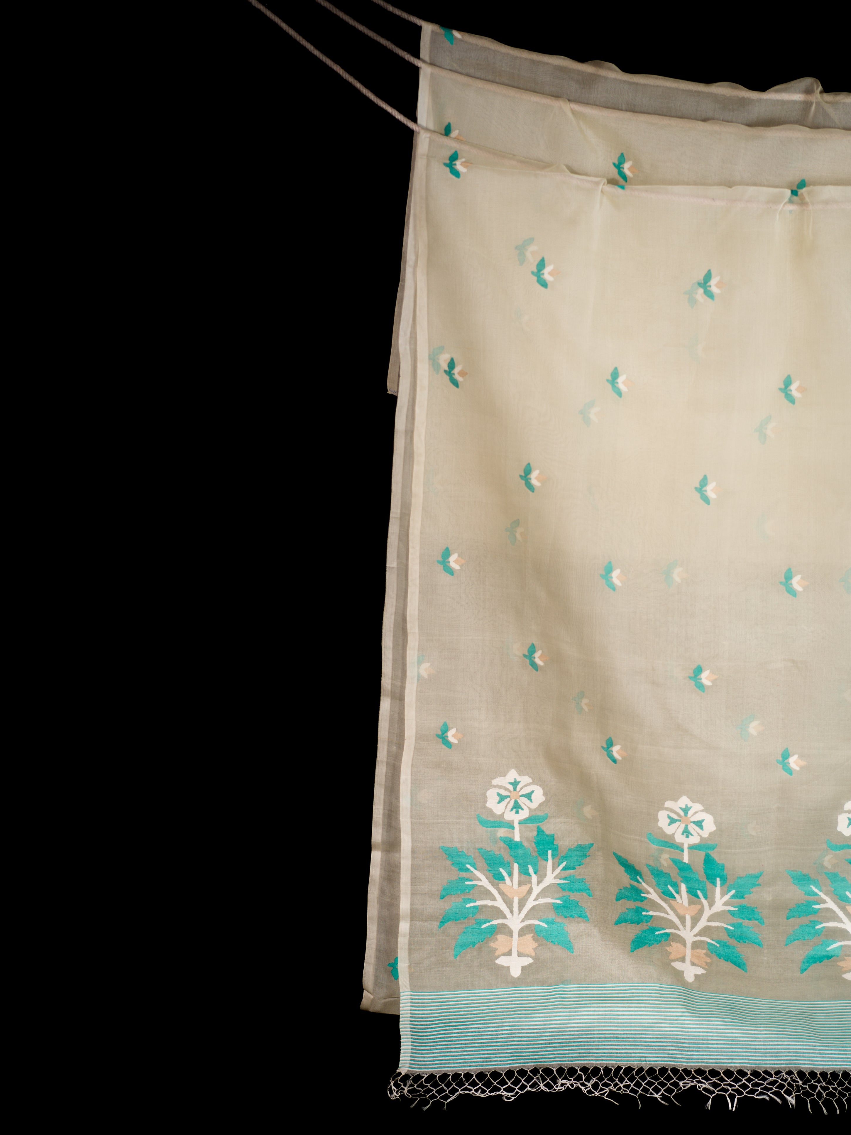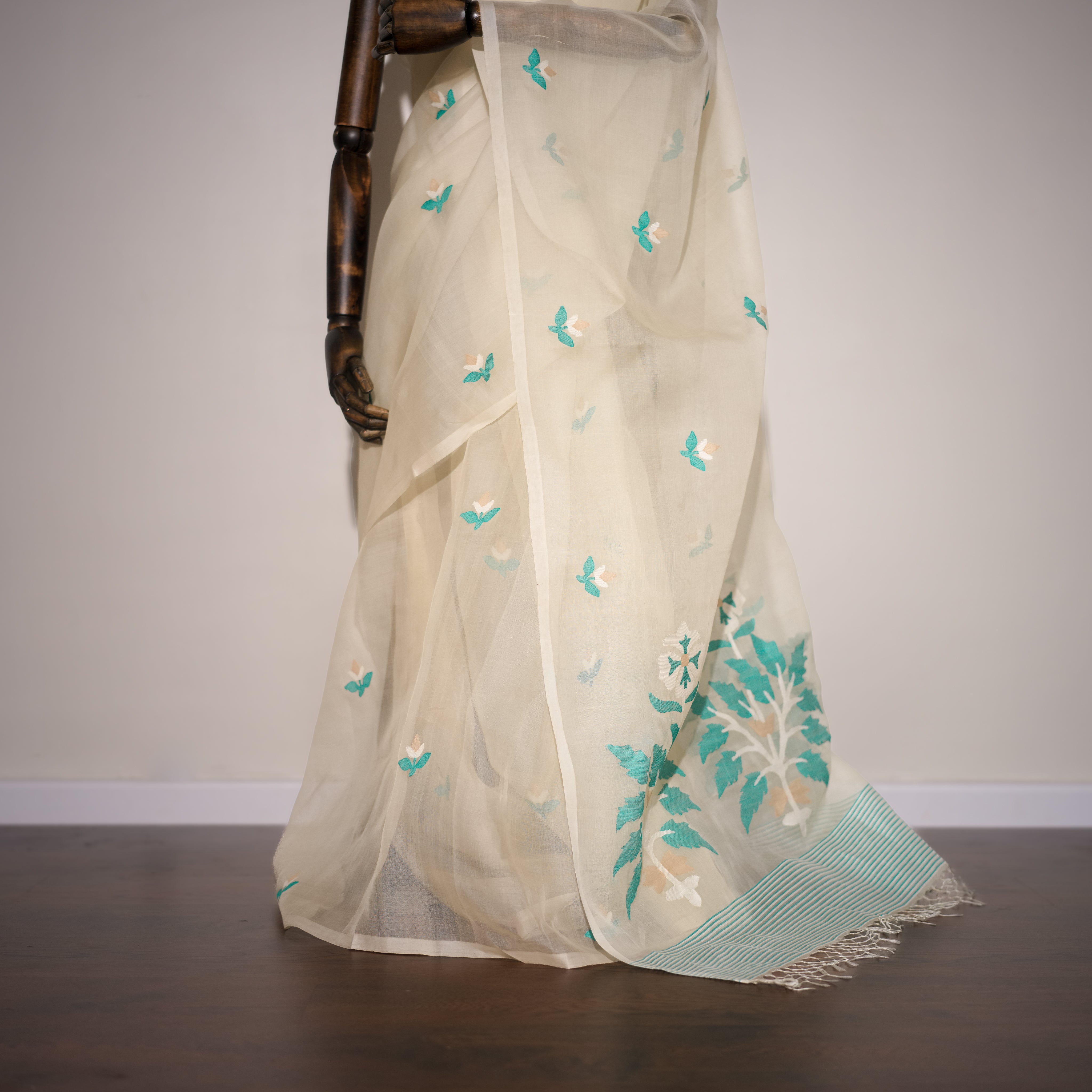 A timeless handwoven Bengal Jamdani saree, crafted in a serene off-white base with aqua green and white floral motifs. The body is delicately adorned with scattered Jamdani butis, while the lower border blooms with rows of intricate floral patterns in aqua and ivory, symbolizing elegance and freshness. The soft cotton weave makes it lightweight, breathable, and perfect for graceful day wear or intimate celebrations.
