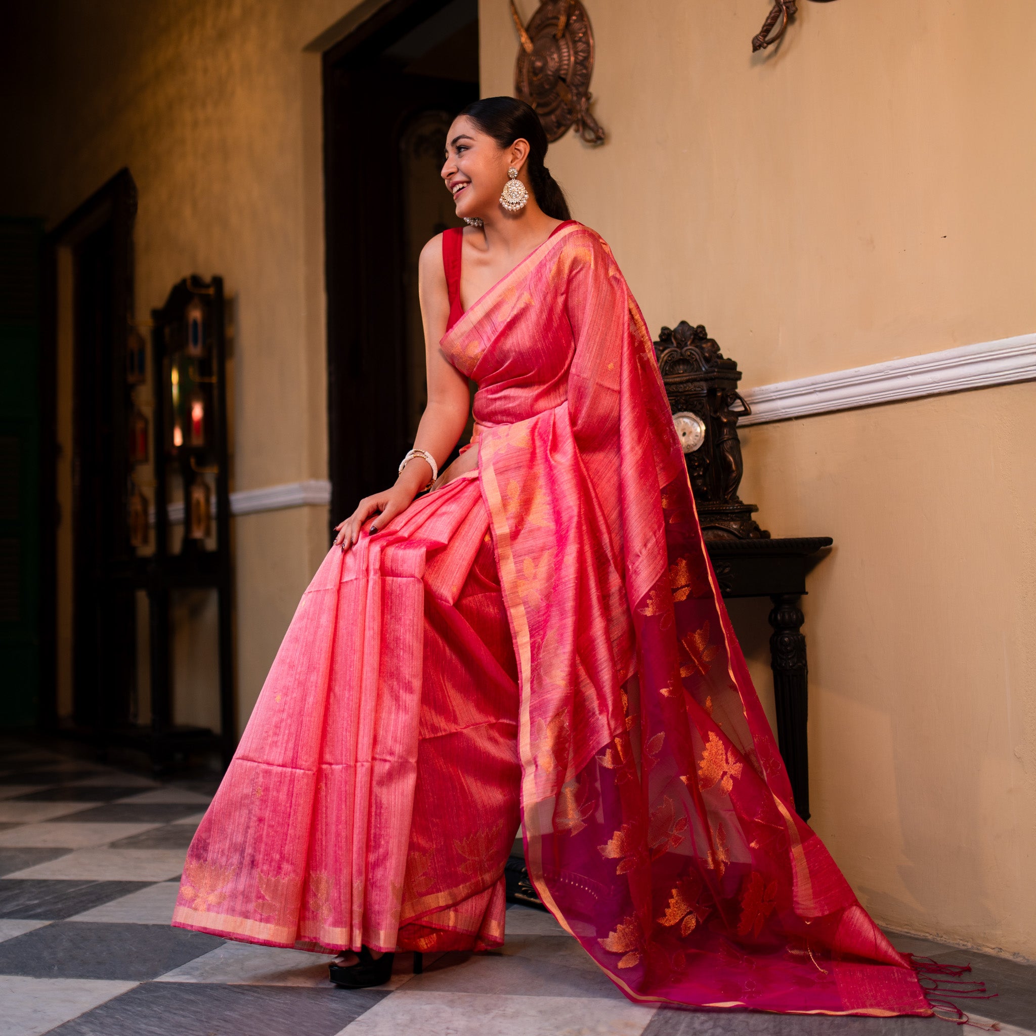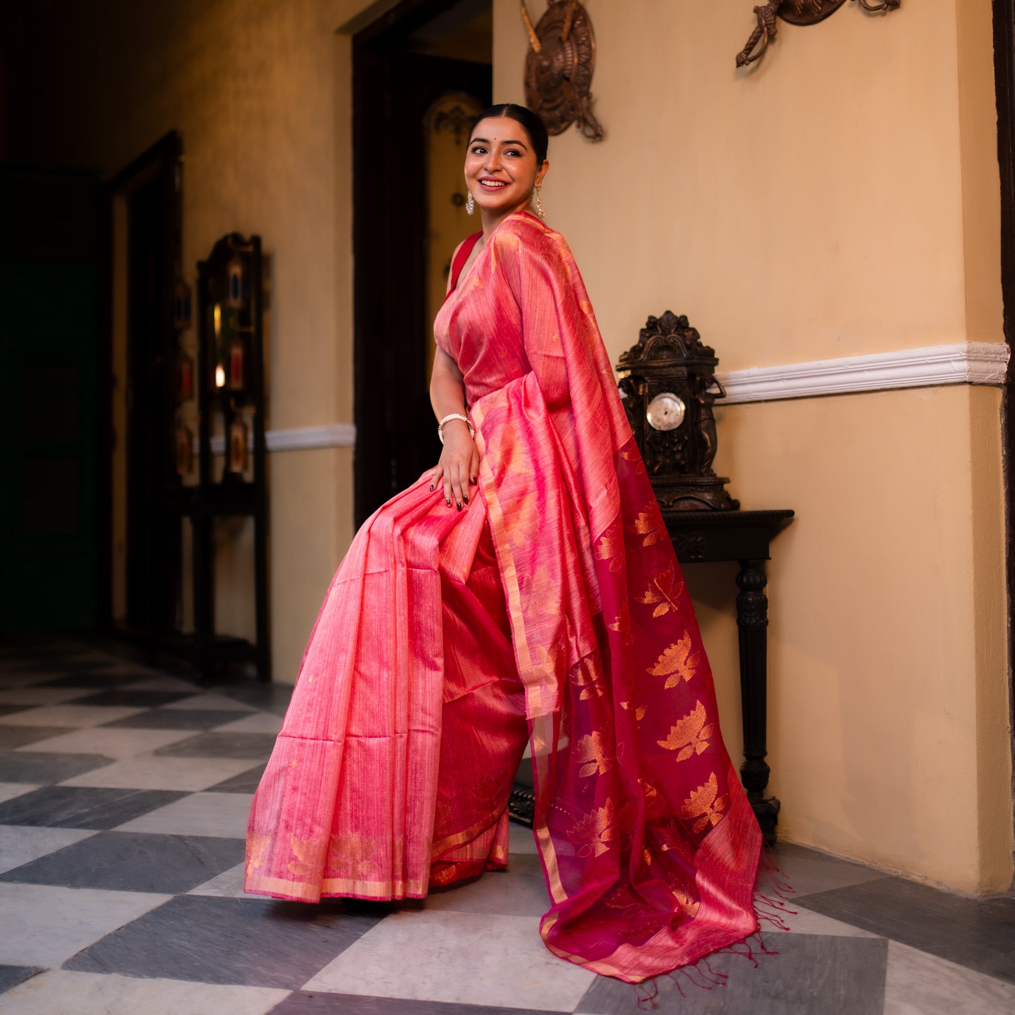 This delicate Resham Matka Jamdaani saree, crafted with traditional artistry, features a rich pink body adorned with intricate floral patterns, ideal for elegant wear.