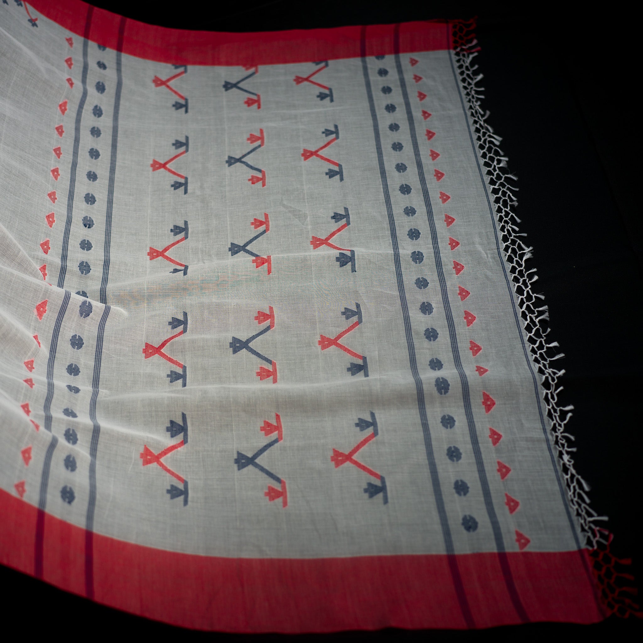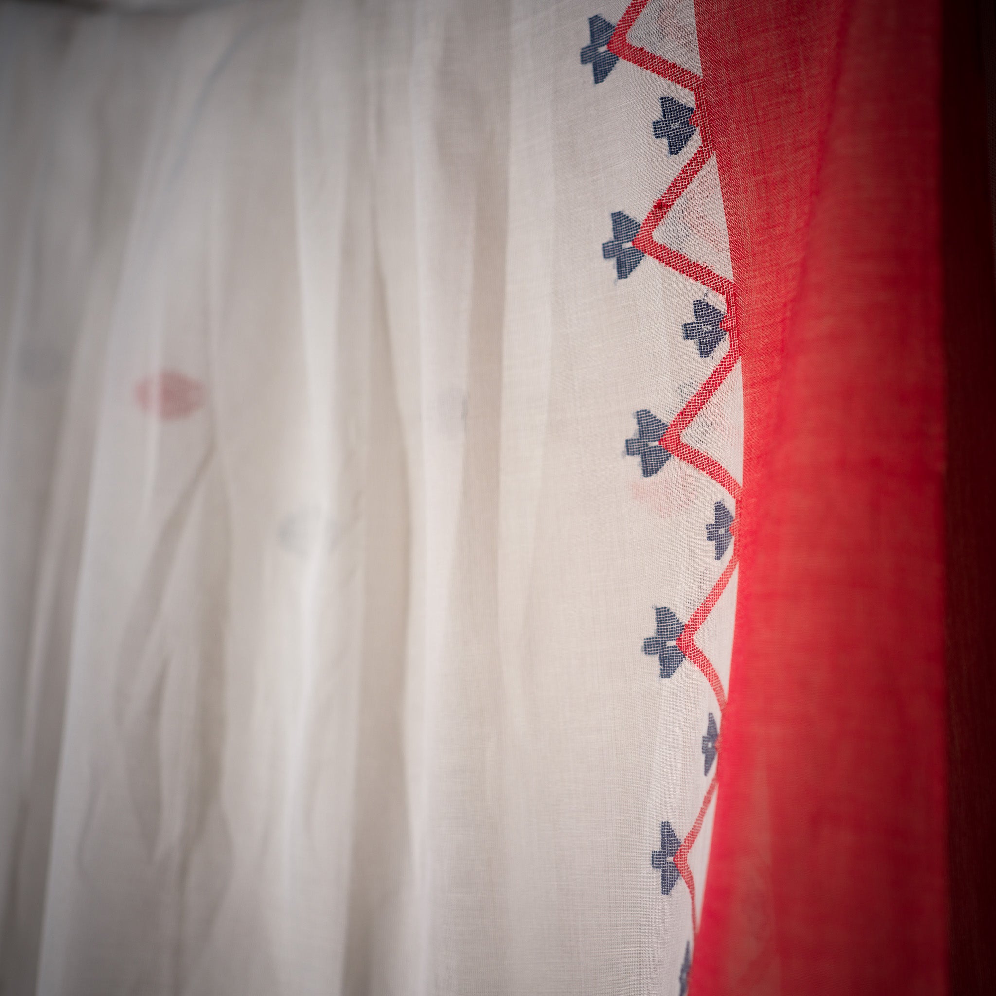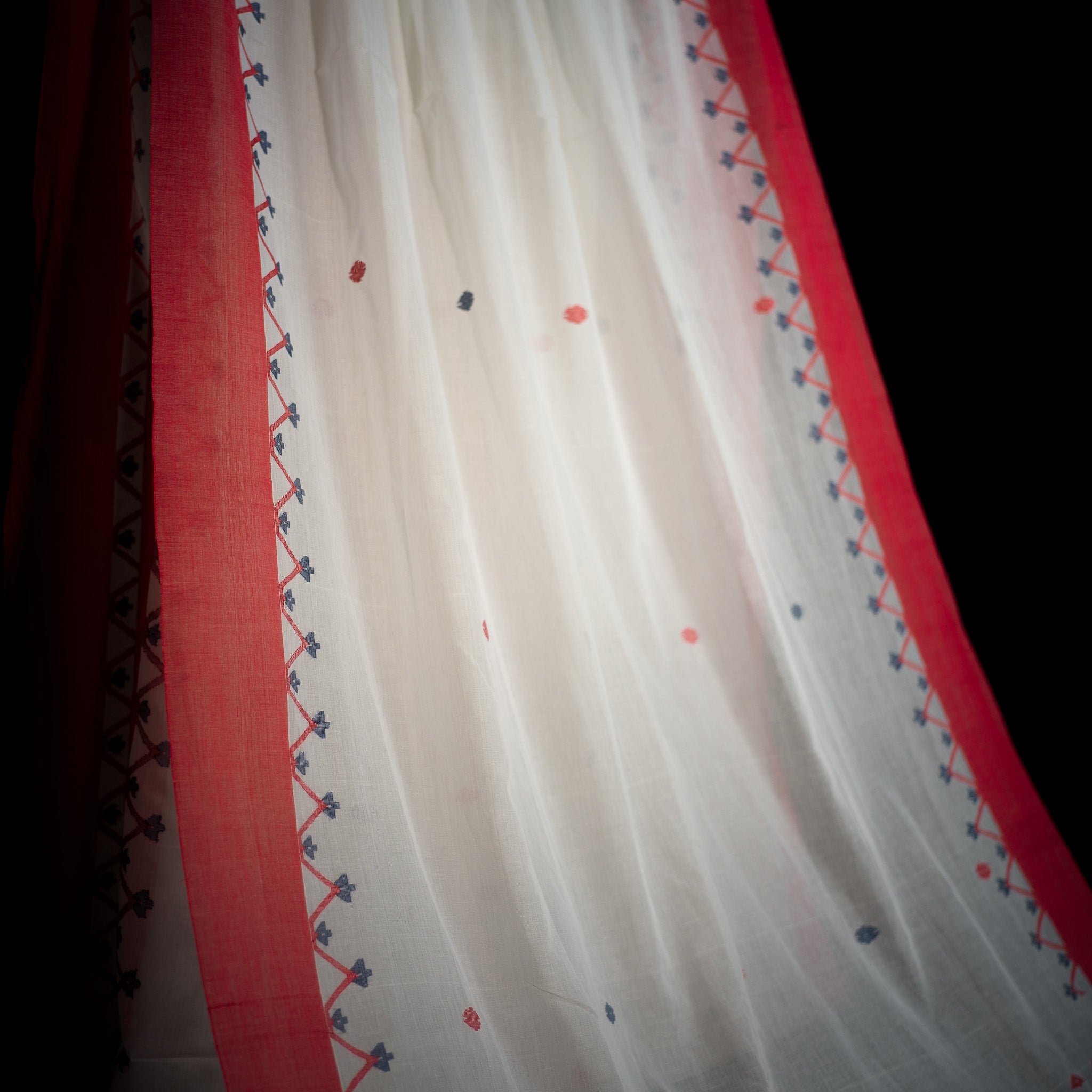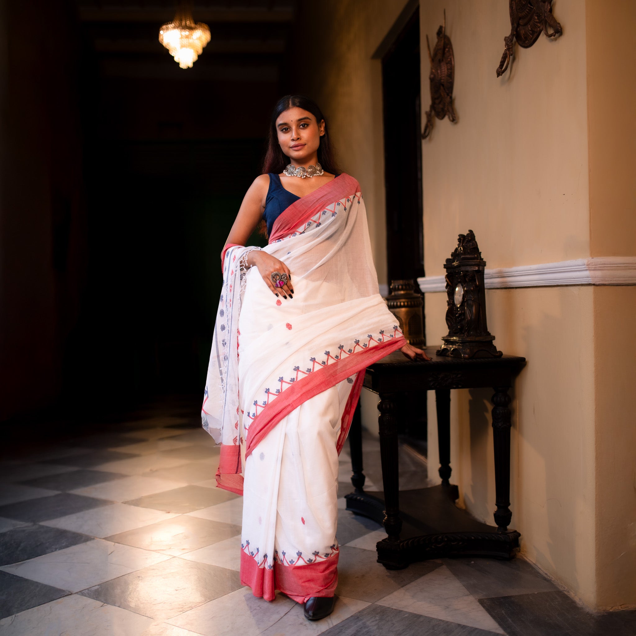 A modern heirloom woven with heritage, this Jamdaani saree is a striking blend of minimalist design and traditional artistry. The white body is framed by subtle red panels and geometric designs in navy blue woven threads. The pallu has a minimalist but classy design, making it a versatile pick for both contemporary and cultural settings. Each thread is a reflection of Bengal’s enduring weaving legacy.