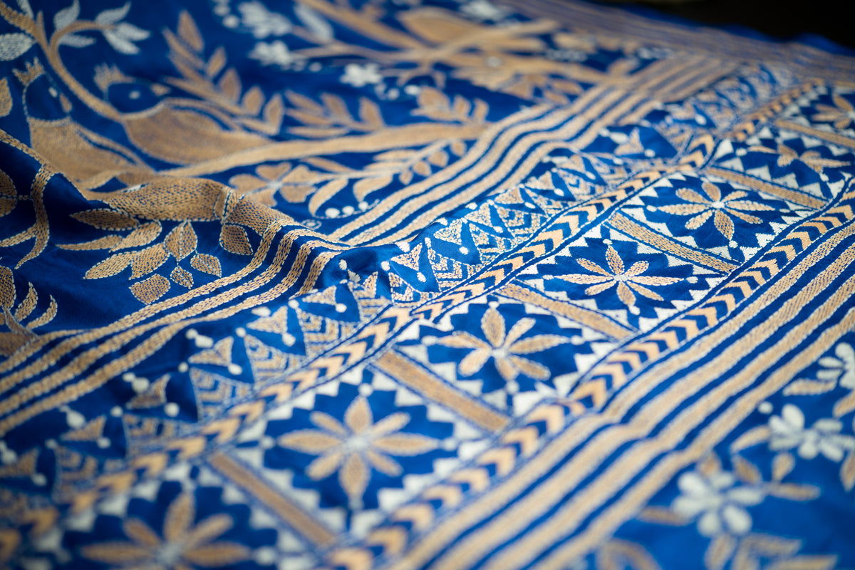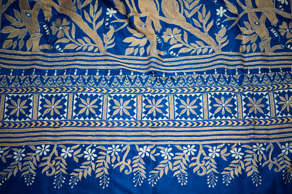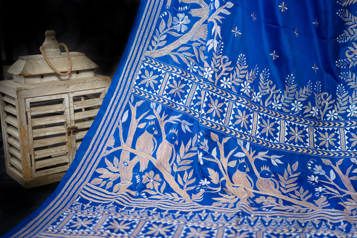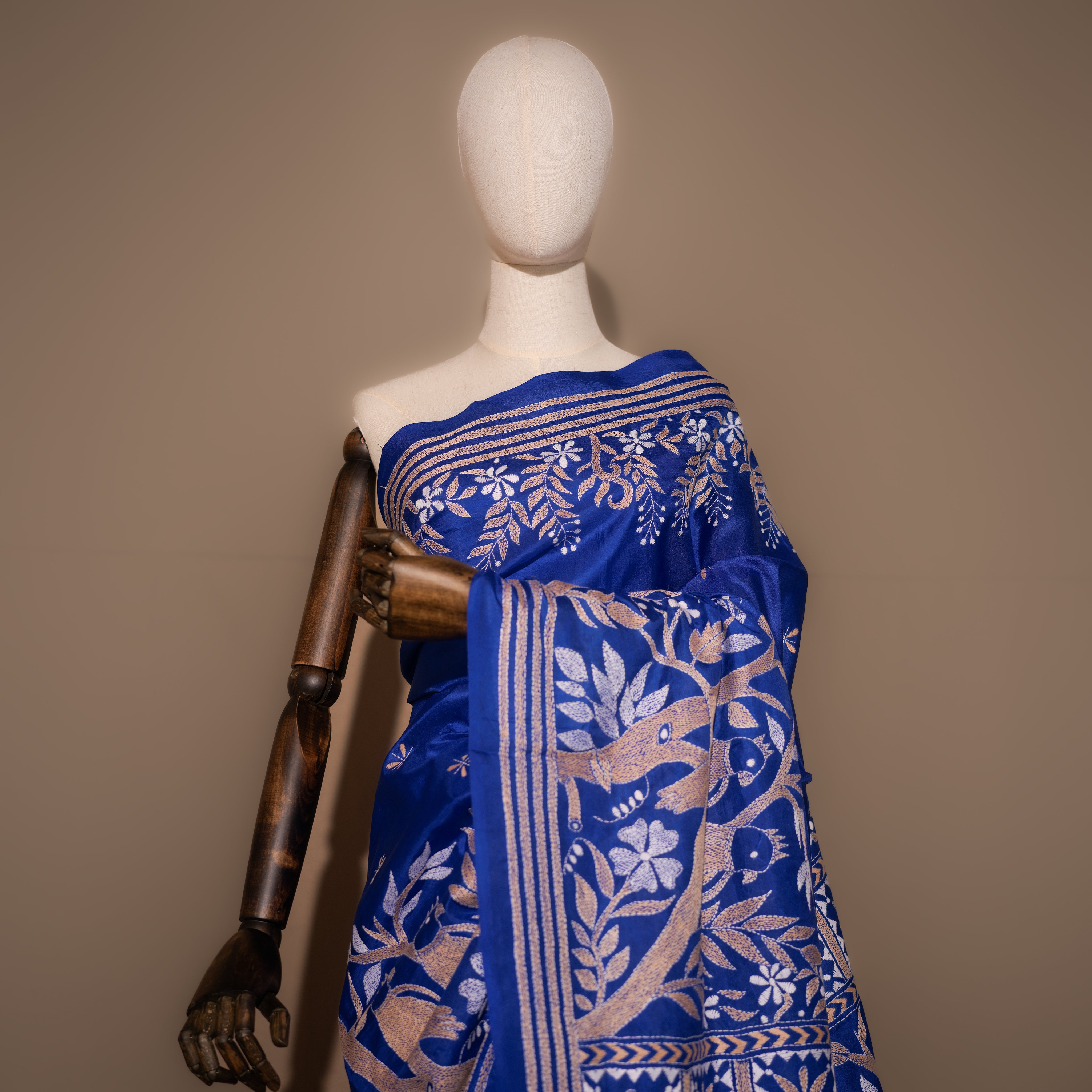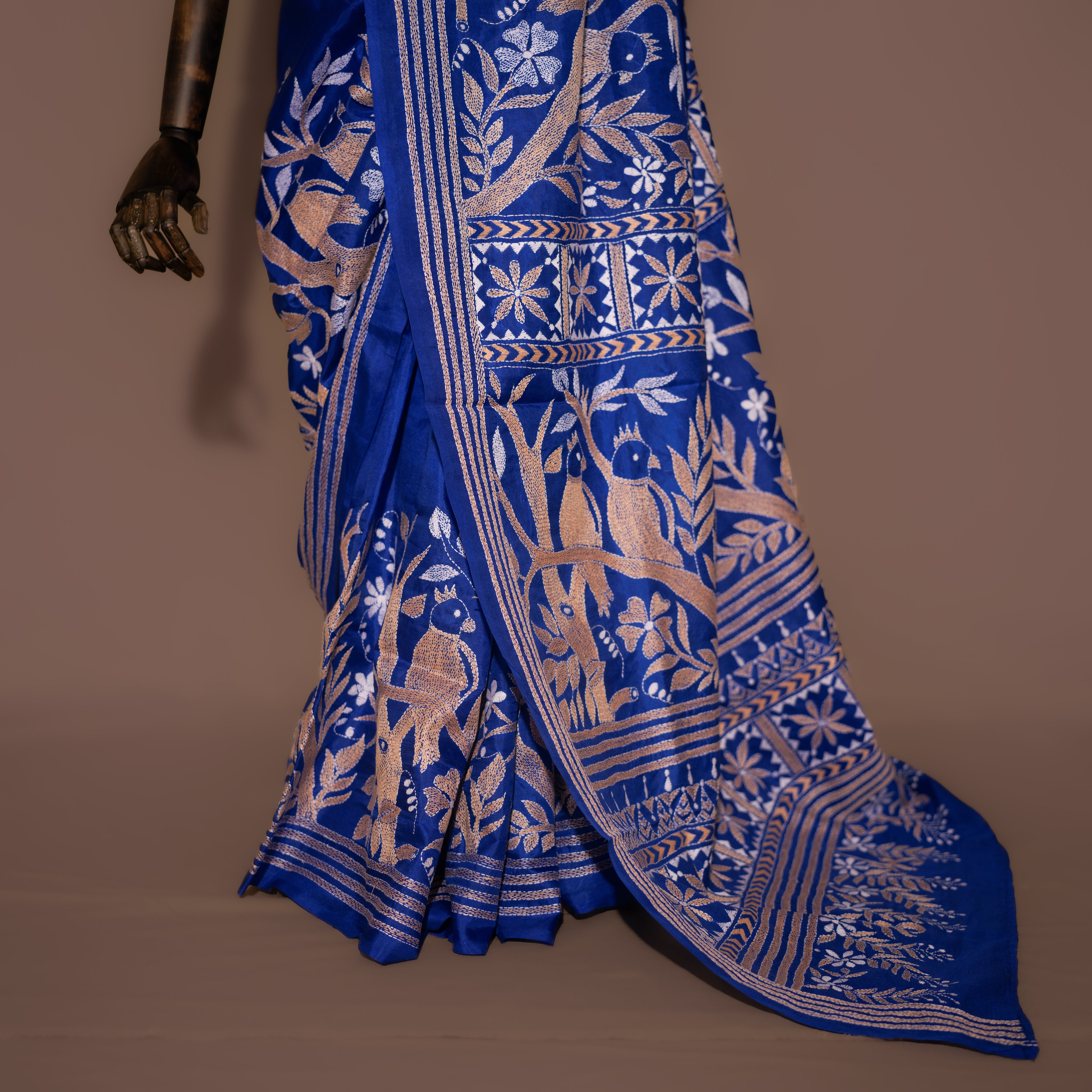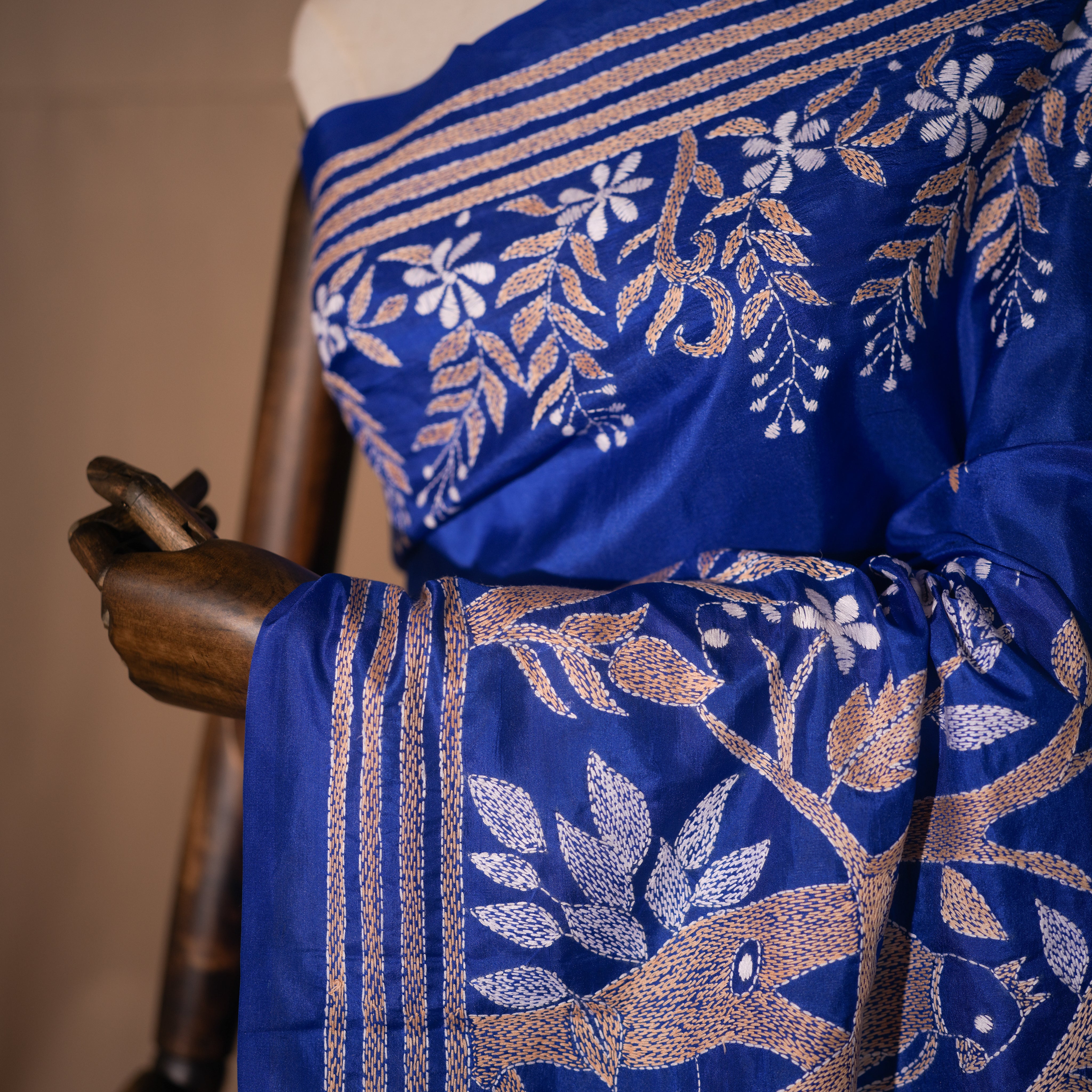 A regal royal blue saree crafted from Bangalore silk, this piece features delicate beige Katha stitch embroidery of birds, florals, and vines. Each motif captures the folk essence of Bengal’s textile artistry in a lyrical, timeless design.
