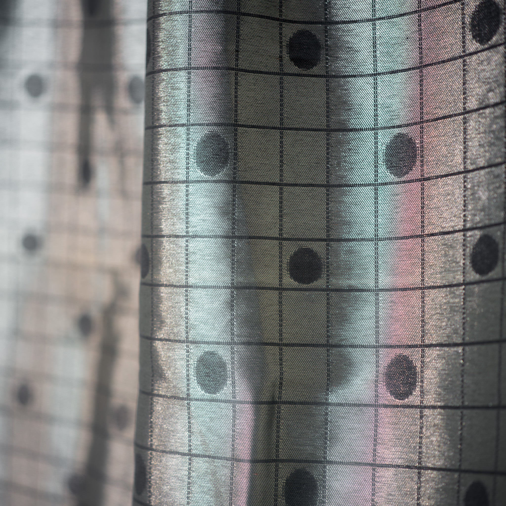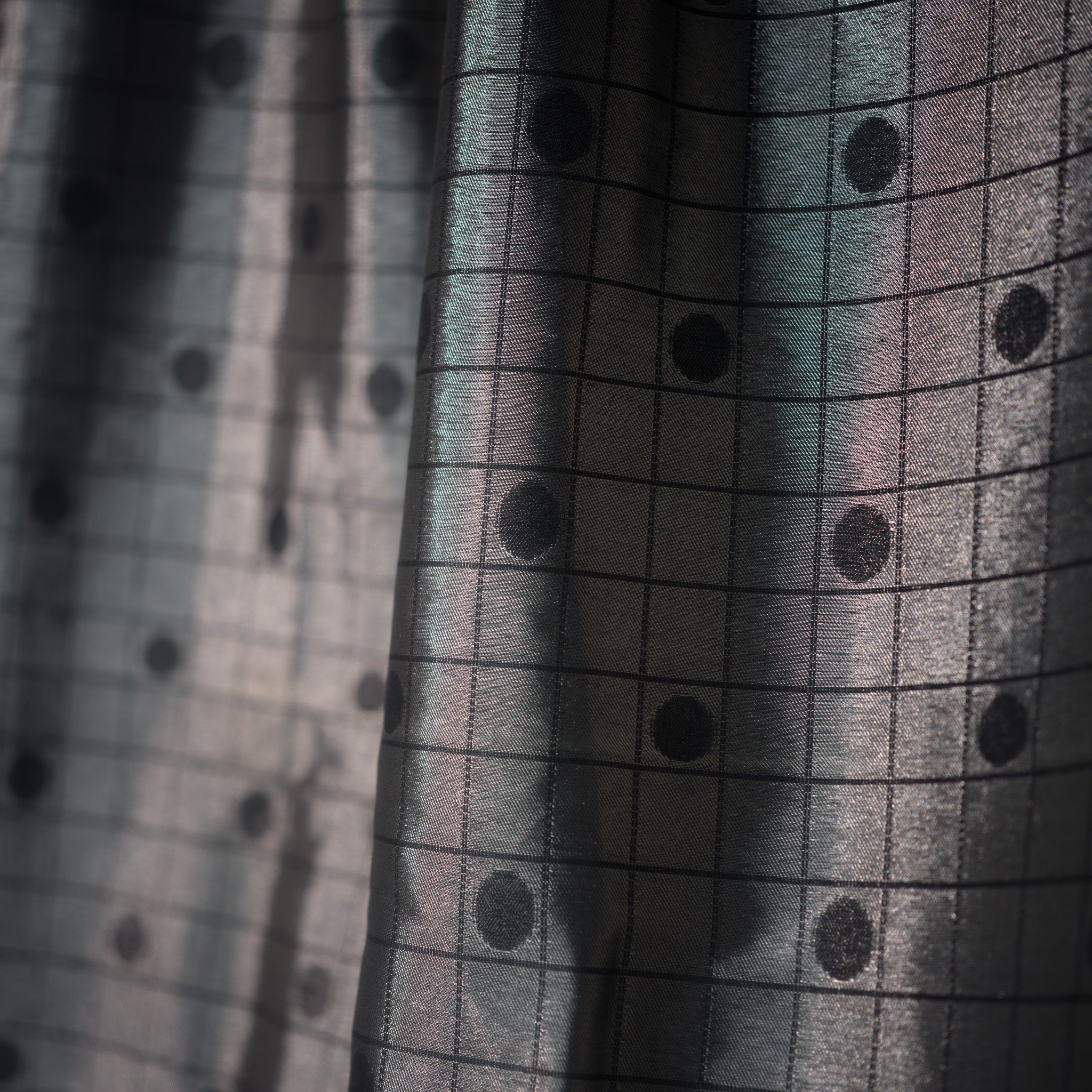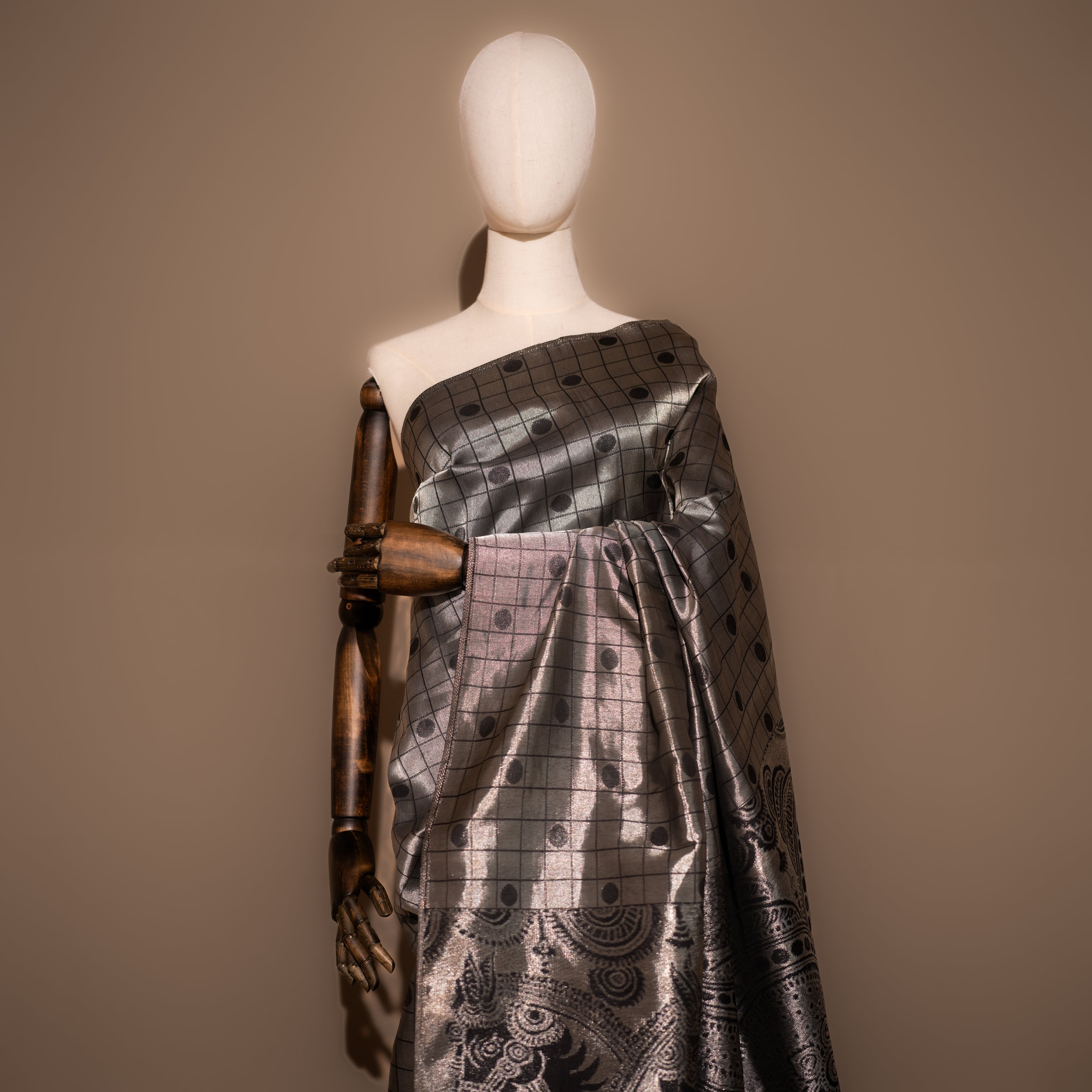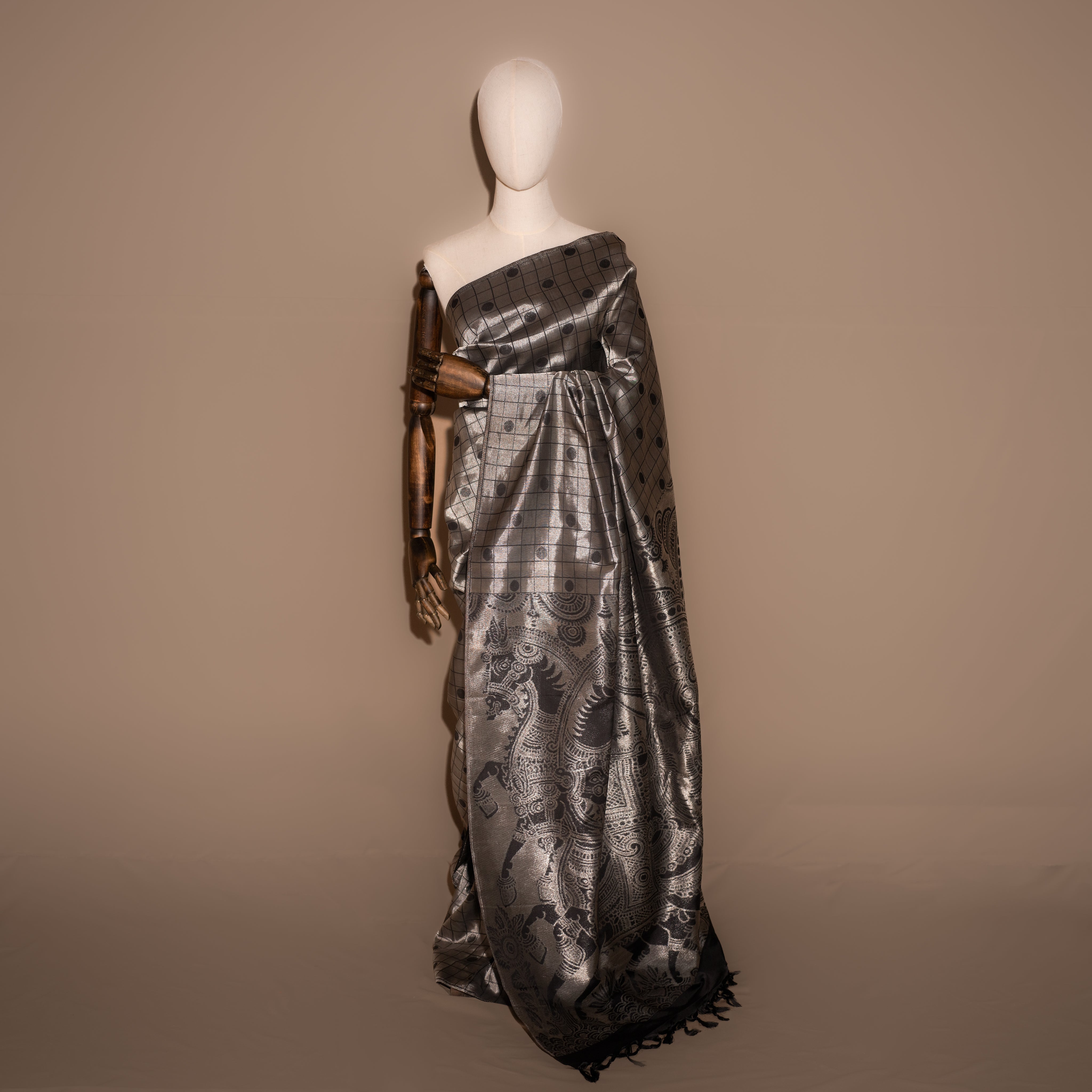 This silver Kanjivaram silk saree features a subtle checked body adorned with small buttas and an intricately woven, grand zari pallu. Its understated elegance and fine craftsmanship make it a refined choice for evening events, receptions, and traditional gatherings.