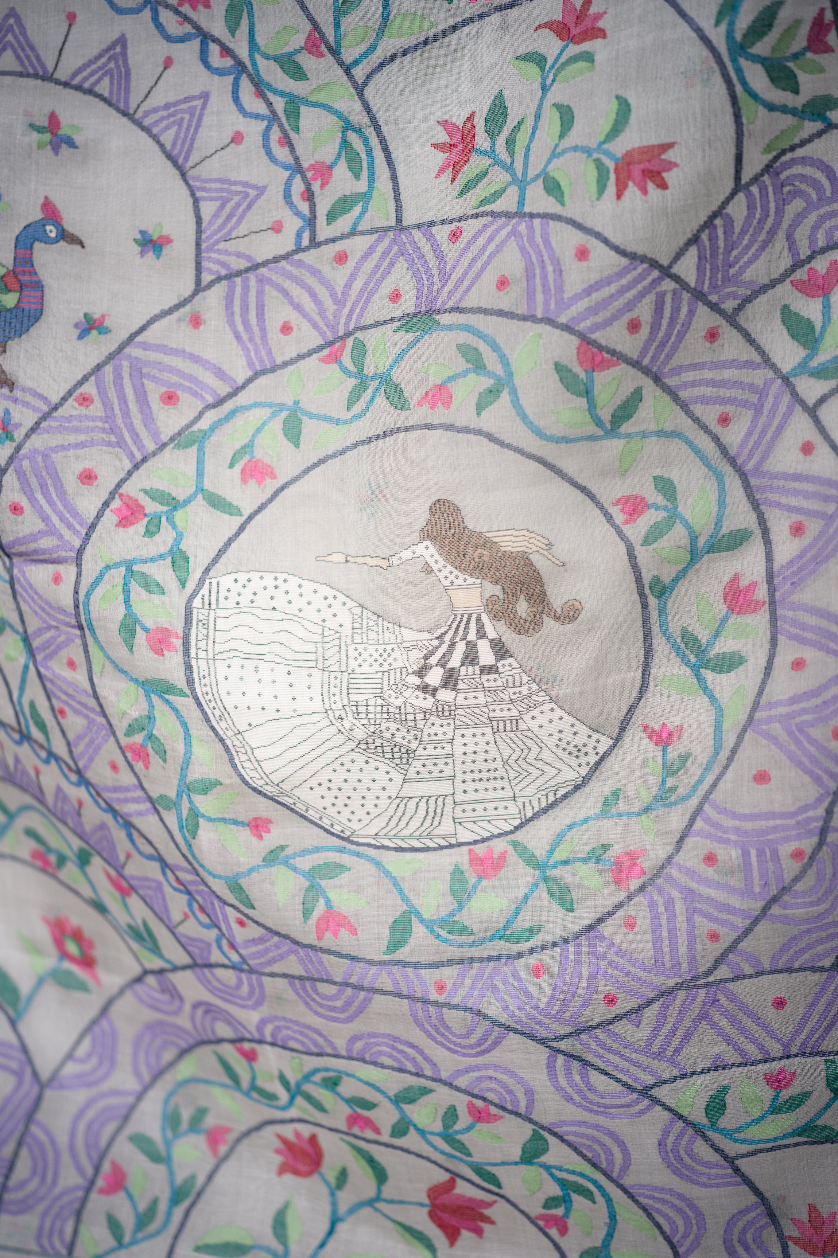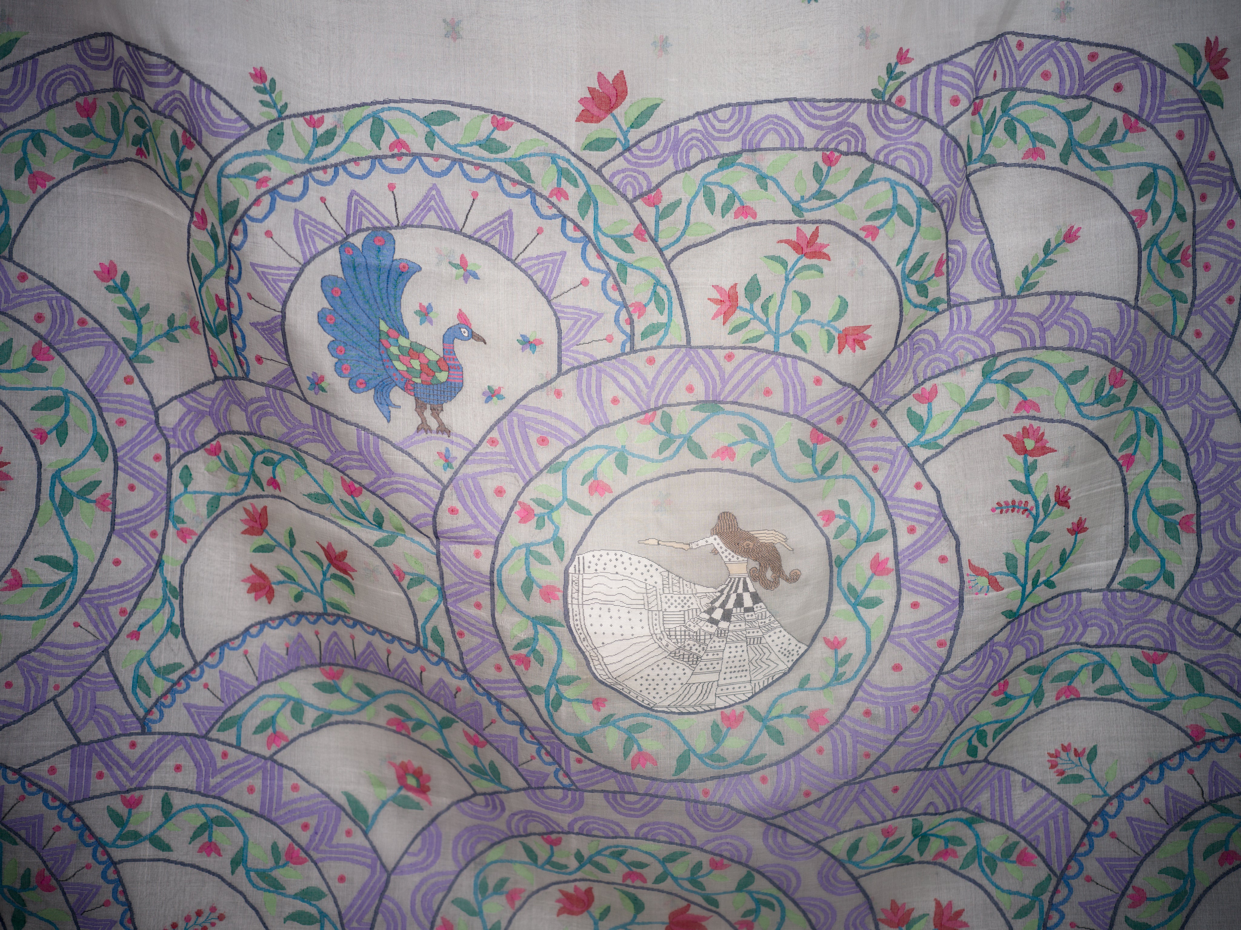 The highlight of this saree lies in its storytelling motifs — a vibrant peacock in full splendor and a graceful dancing figure, delicately framed by floral arches and geometric patterns in hues of lavender, green, red, and blue. Each motif is painstakingly woven by hand, not embroidered, making Jamdani one of the most sophisticated and time-intensive weaving techniques in the world.