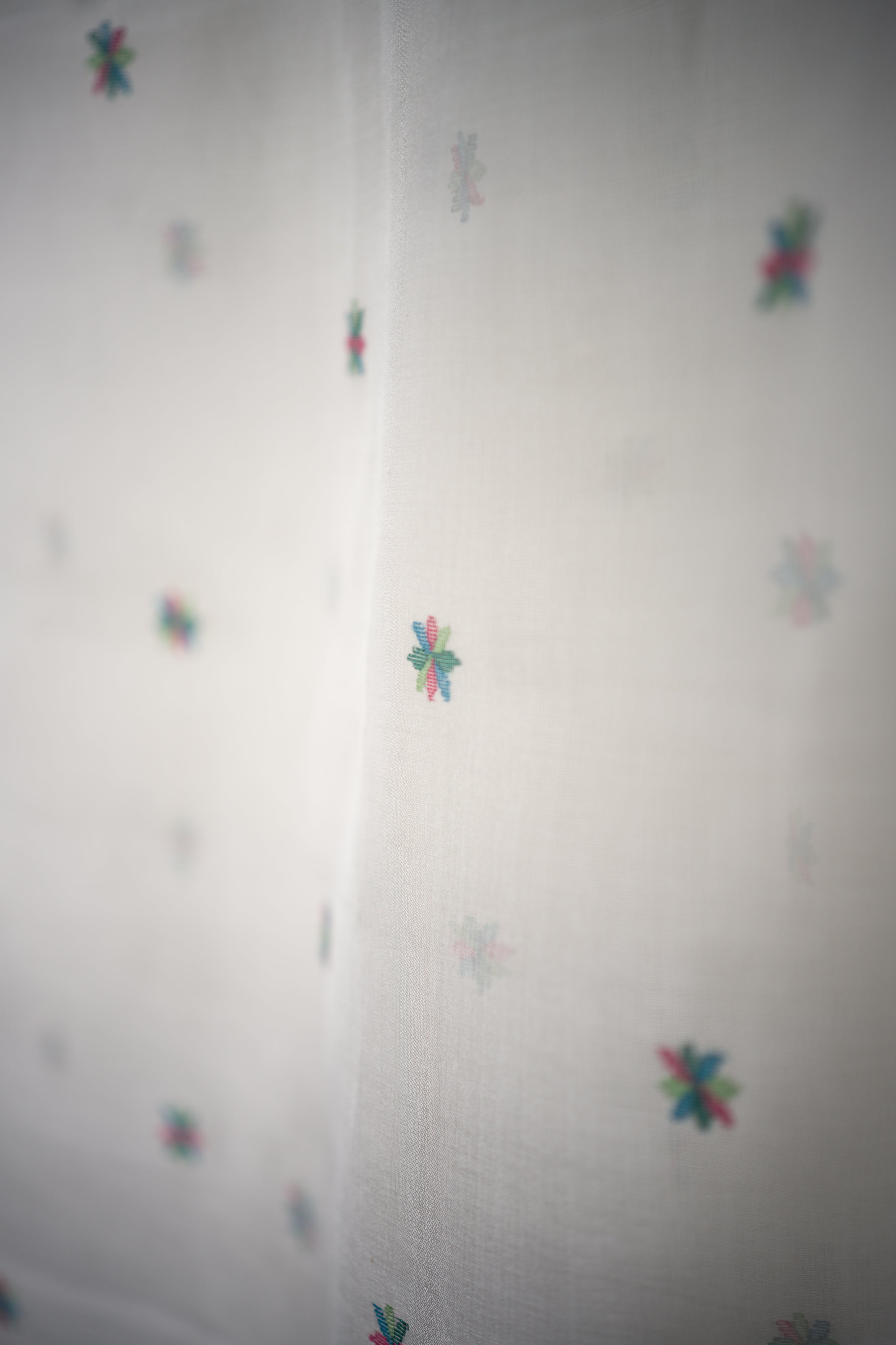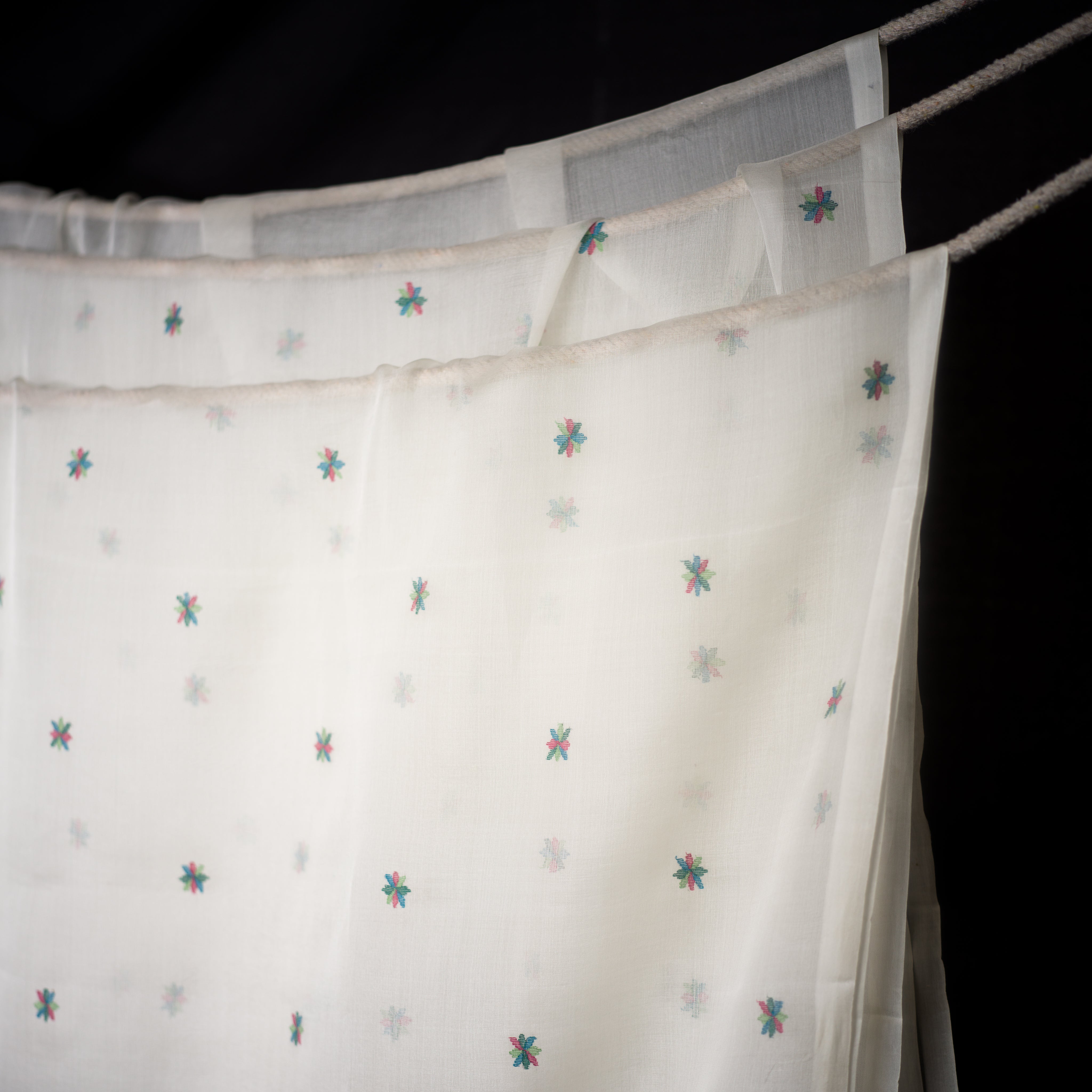 The translucent white body of the saree is adorned with tiny star-like butis, lending it an ethereal charm, while the pallu bursts into color and detail, making this saree both elegant and dramatic.