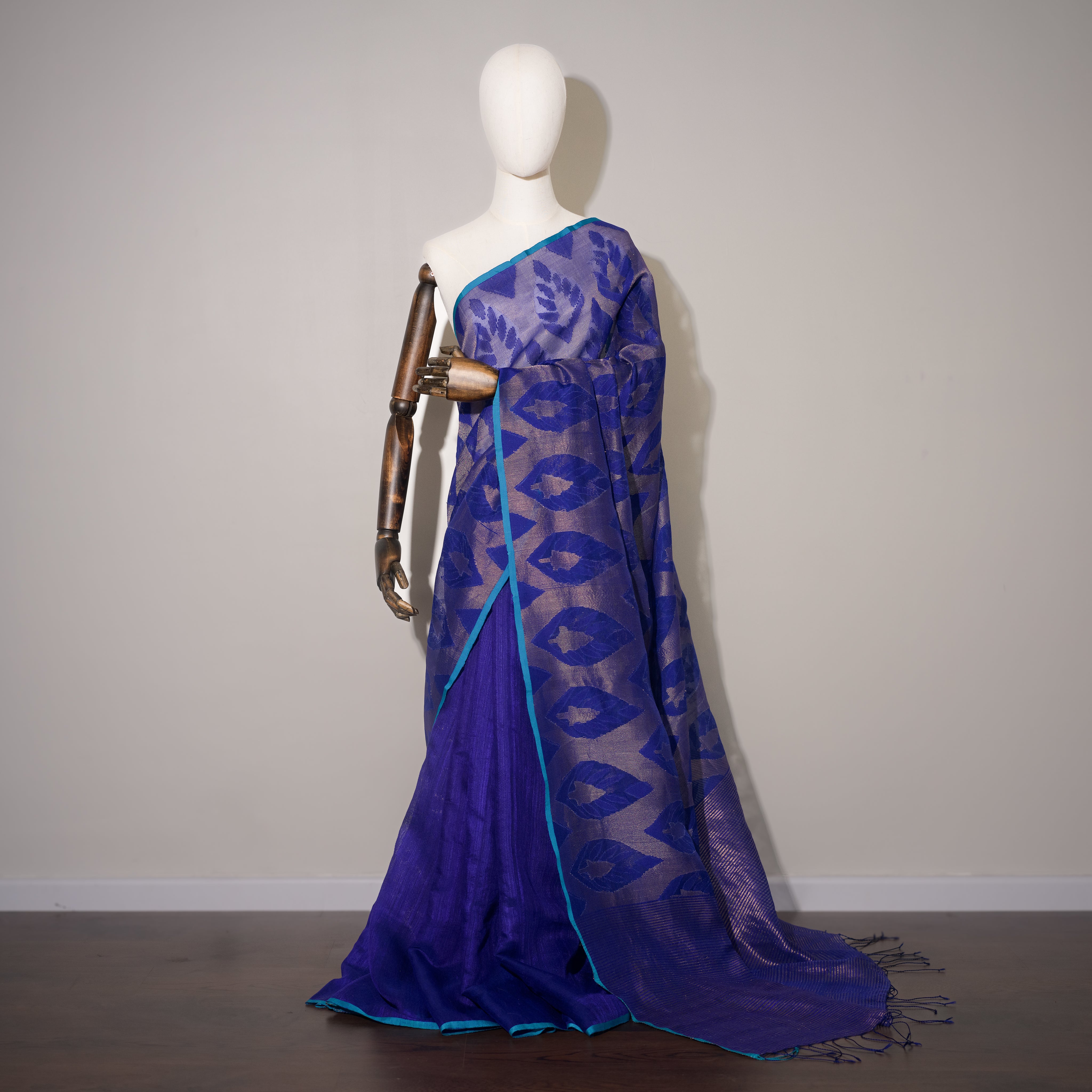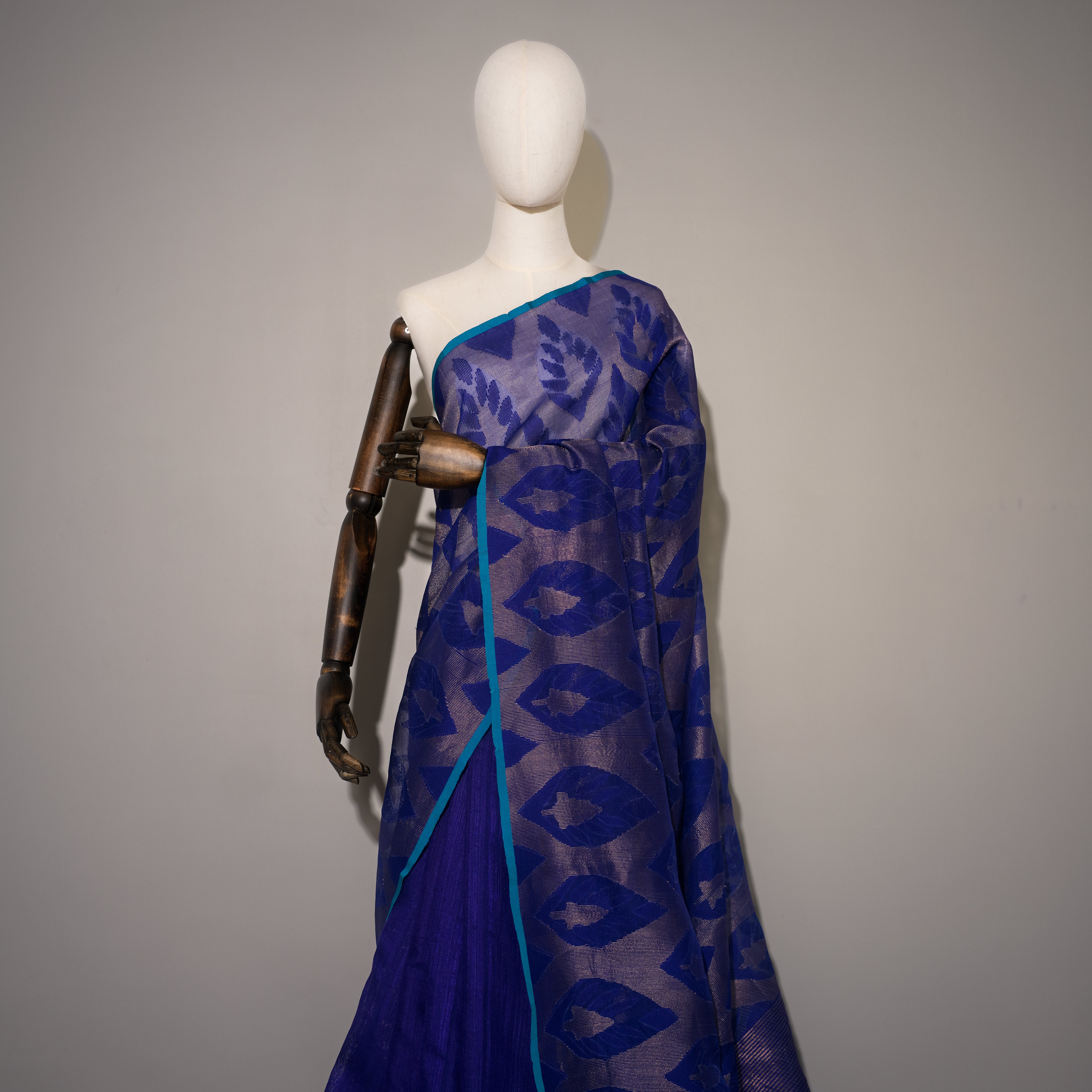 This saree is a true statement of elegance and artistry, combining the rustic richness of pure matka silk with the delicate finesse of muslin jamdani weaving. The body of the saree flows in a solid, vibrant robin blue hue, exuding bold sophistication, while the contrasting pallu unfurls into intricate jamdani motifs woven on muslin, adding grace, lightness, and exquisite detailing. A creation that marries strength and subtlety, this saree is perfect for occasions where tradition meets modern vibrance.