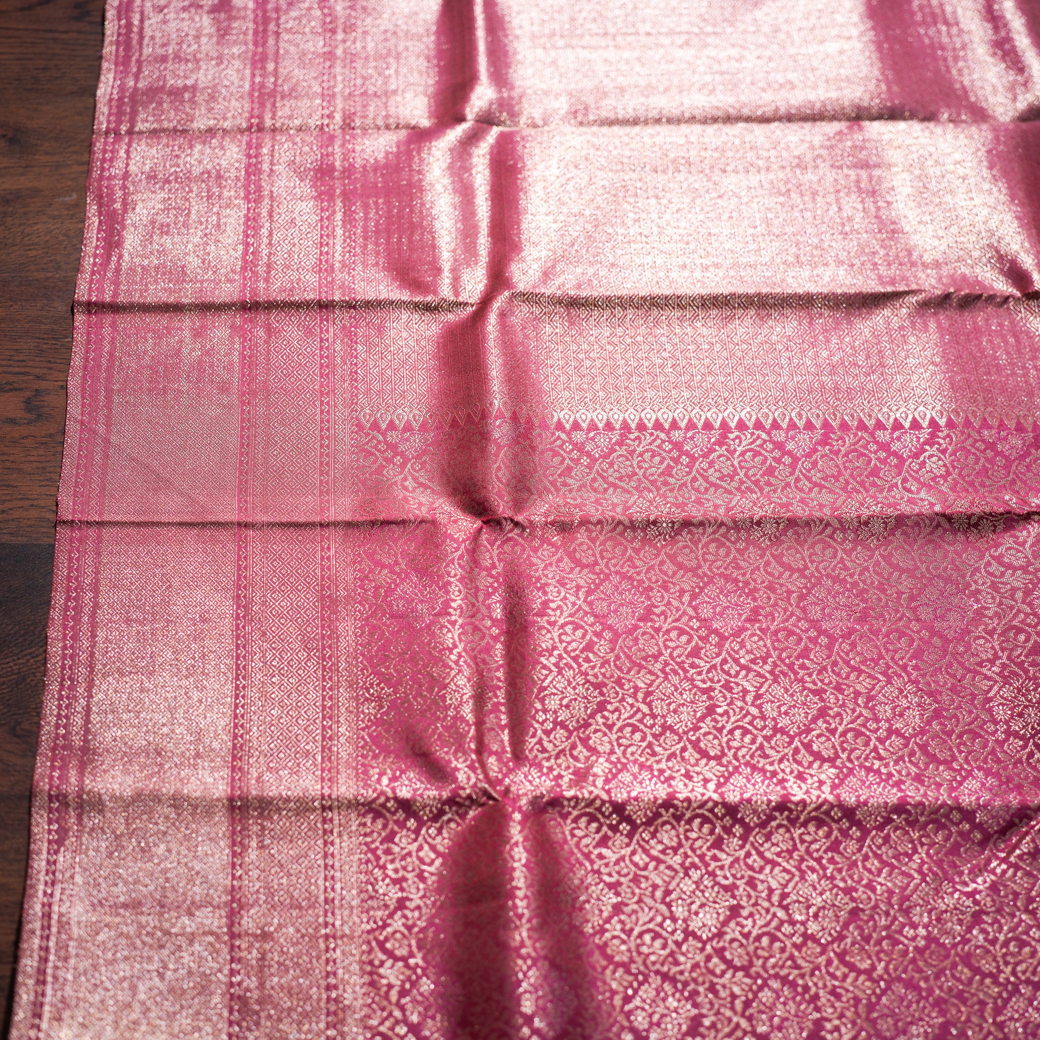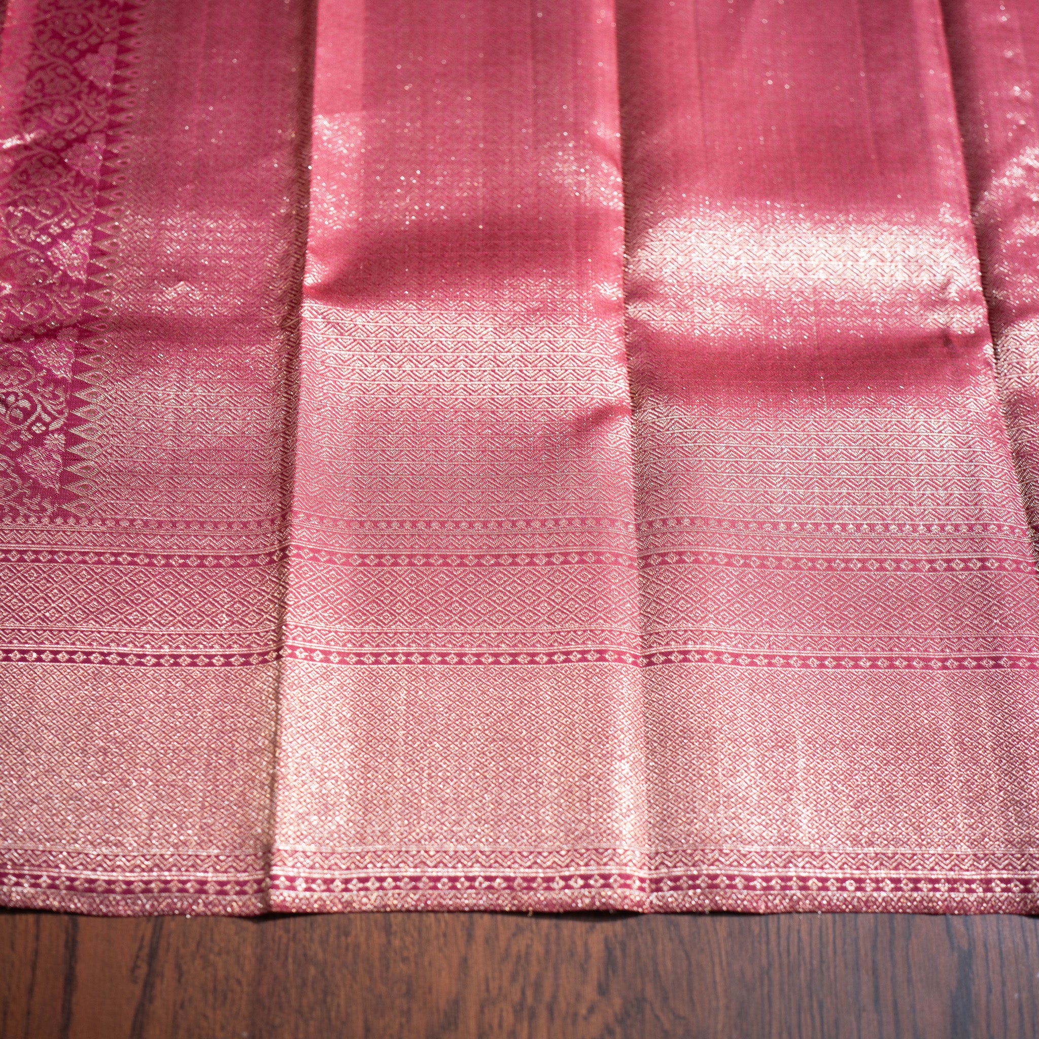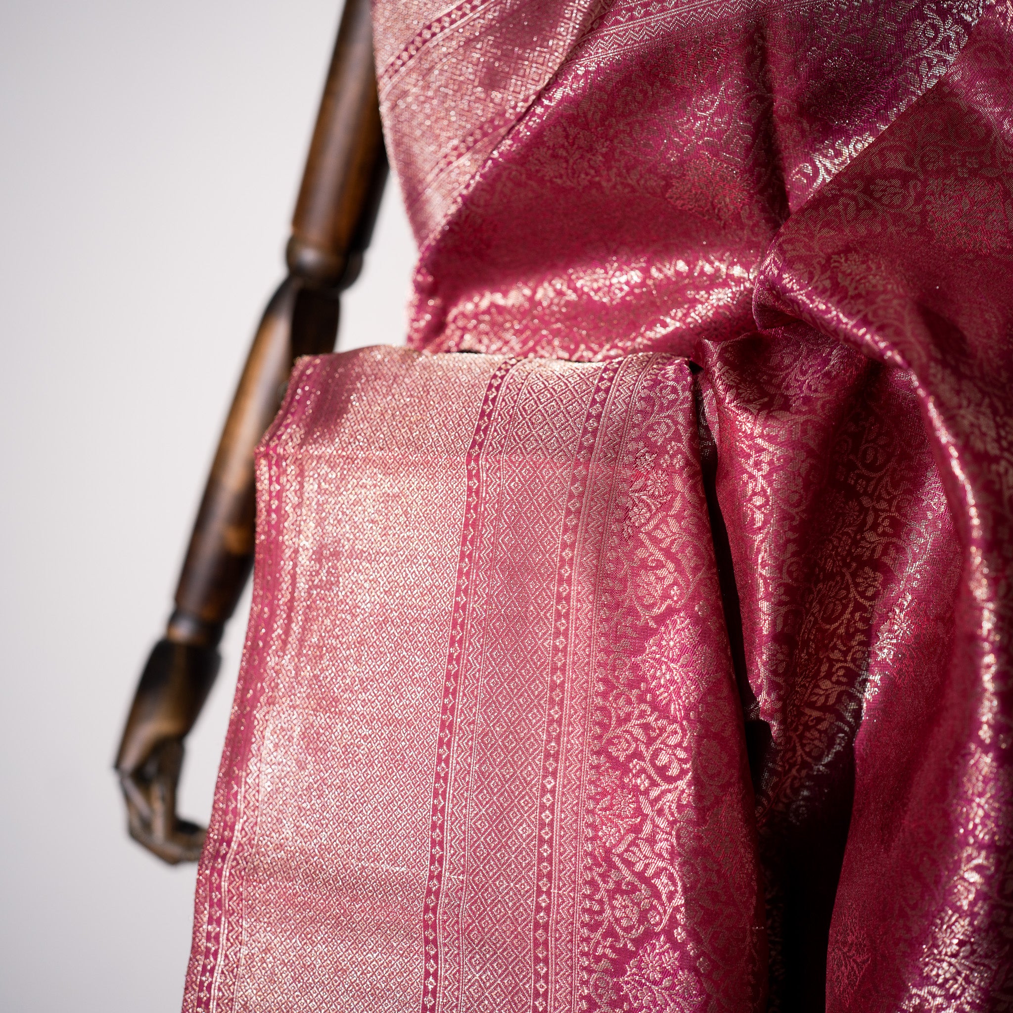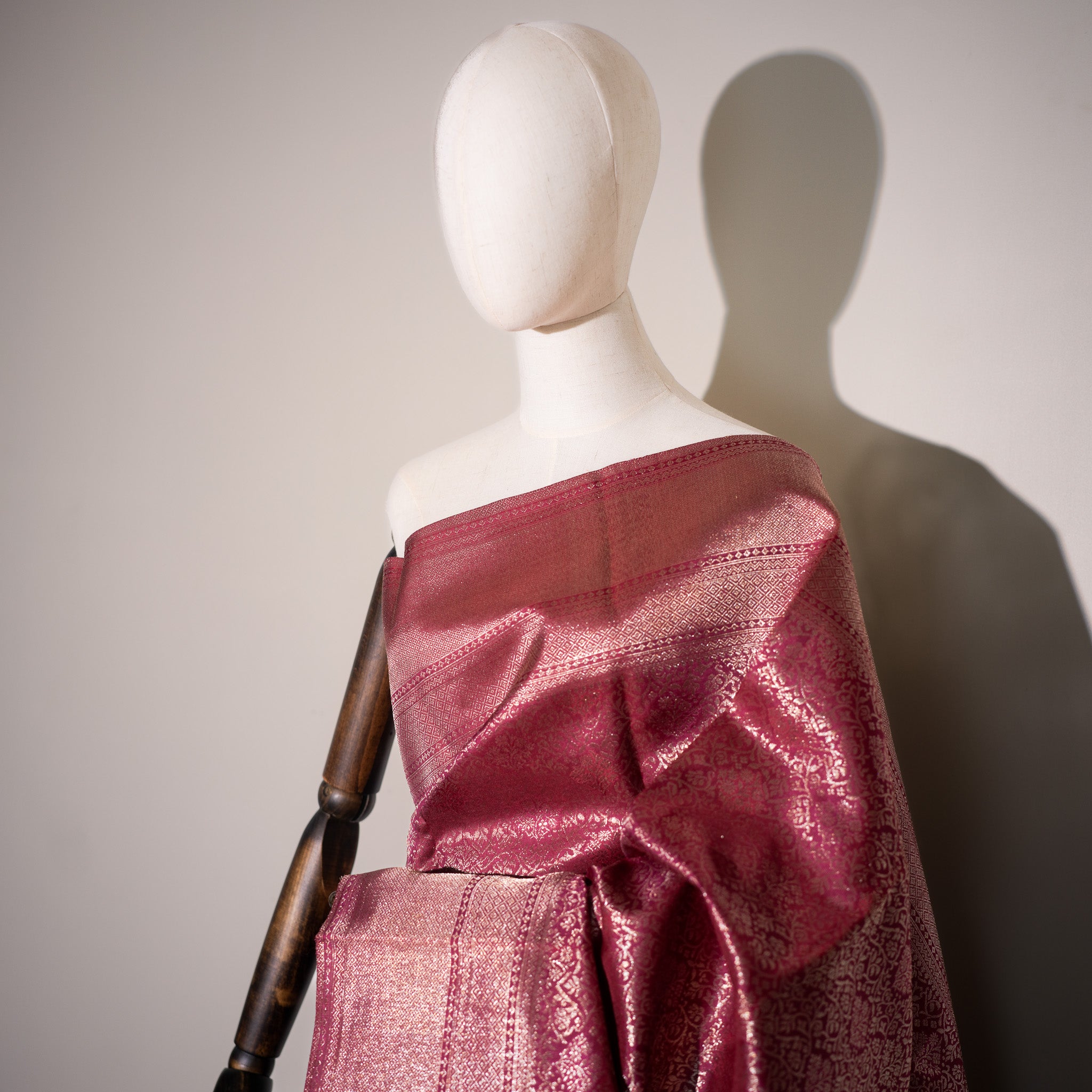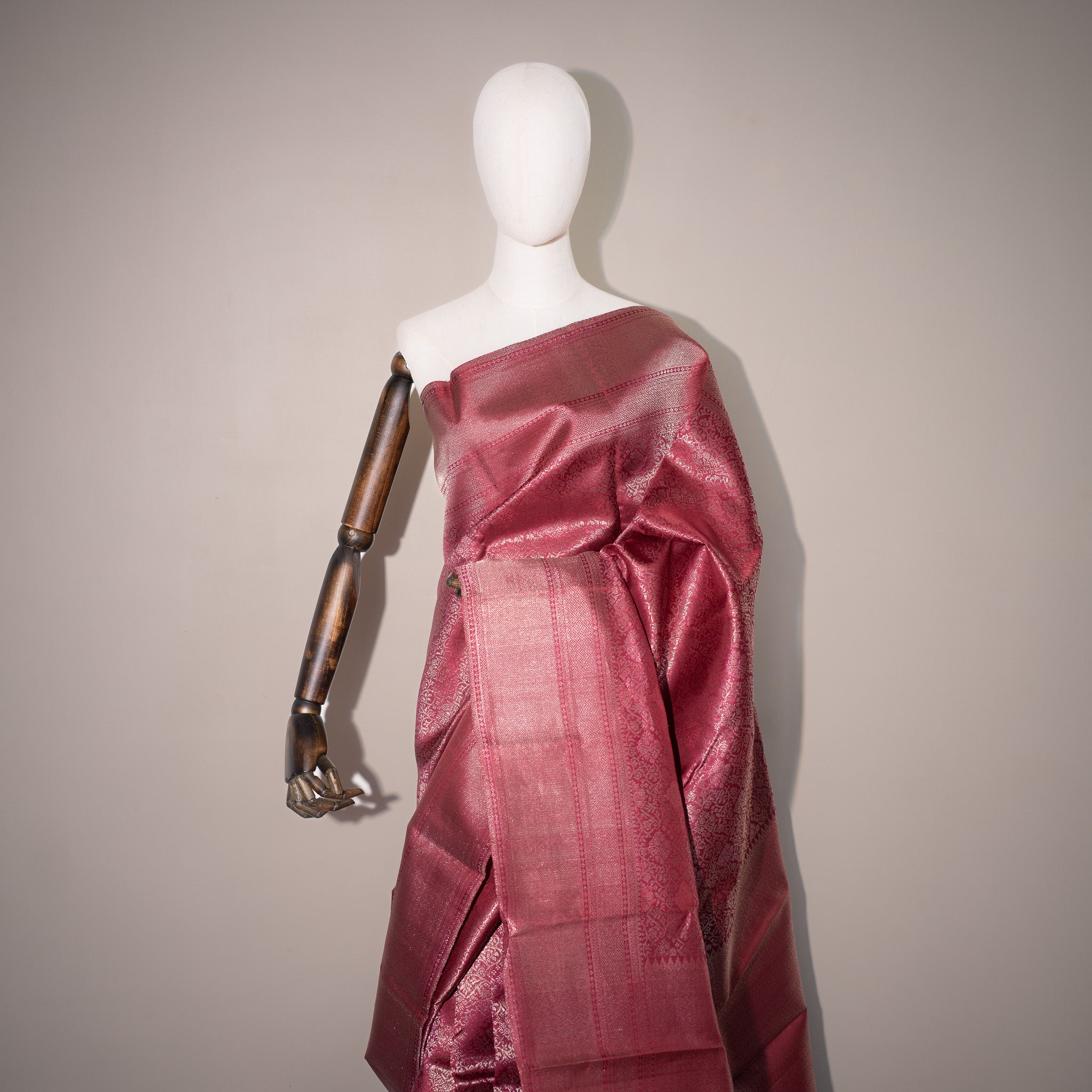 Timeless and graceful, this pure Kanjivaram silk saree from Kanchipuram captures the essence of classic South Indian wedding elegance. Draped in a soft yet striking rosewood pink hue, it radiates a warm glow with its finely woven self-zari detailing that enhances the silk’s natural lustre. The intricate border and pallu, crafted with meticulous precision, add depth and richness to the drape, making it a perfect choice for brides, side brides, and wedding guests seeking refined sophistication. This saree beautifully marries traditional craftsmanship with subtle opulence — a true heirloom piece for any celebration.