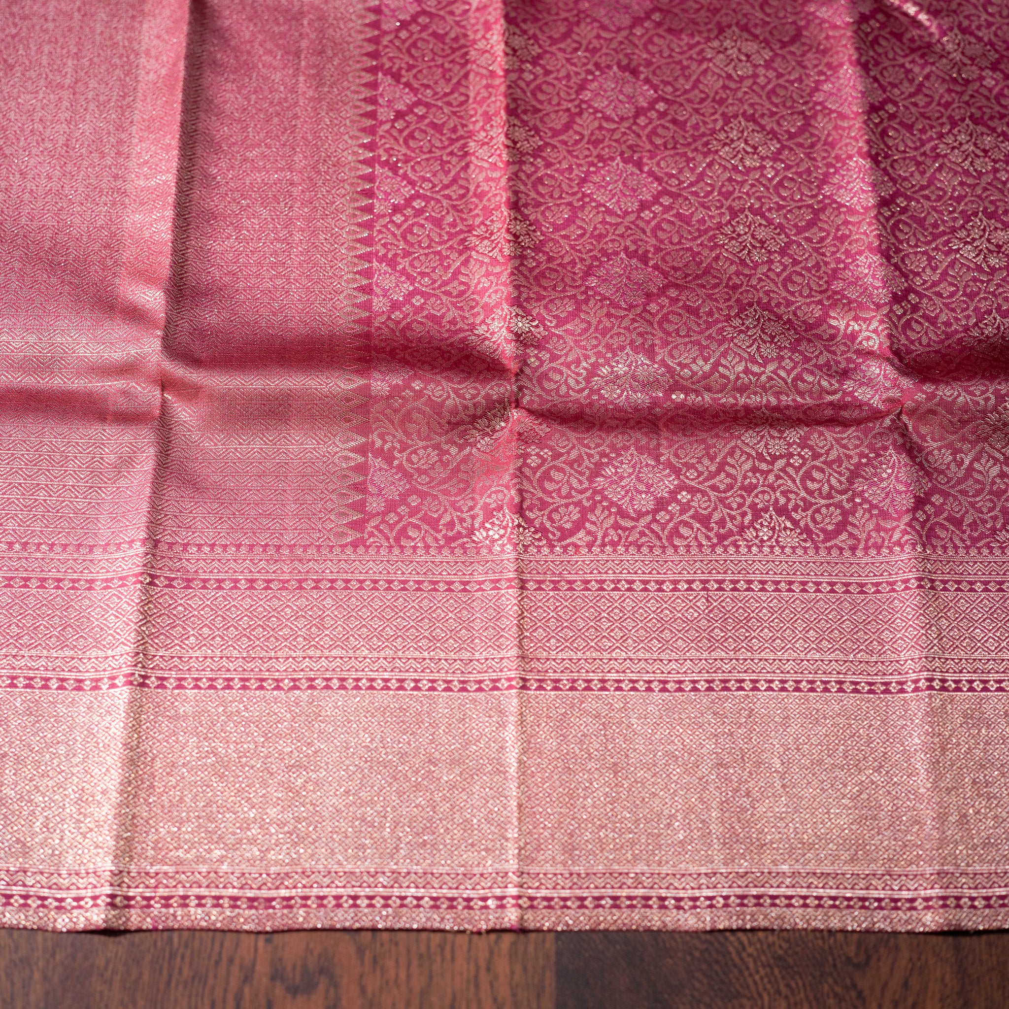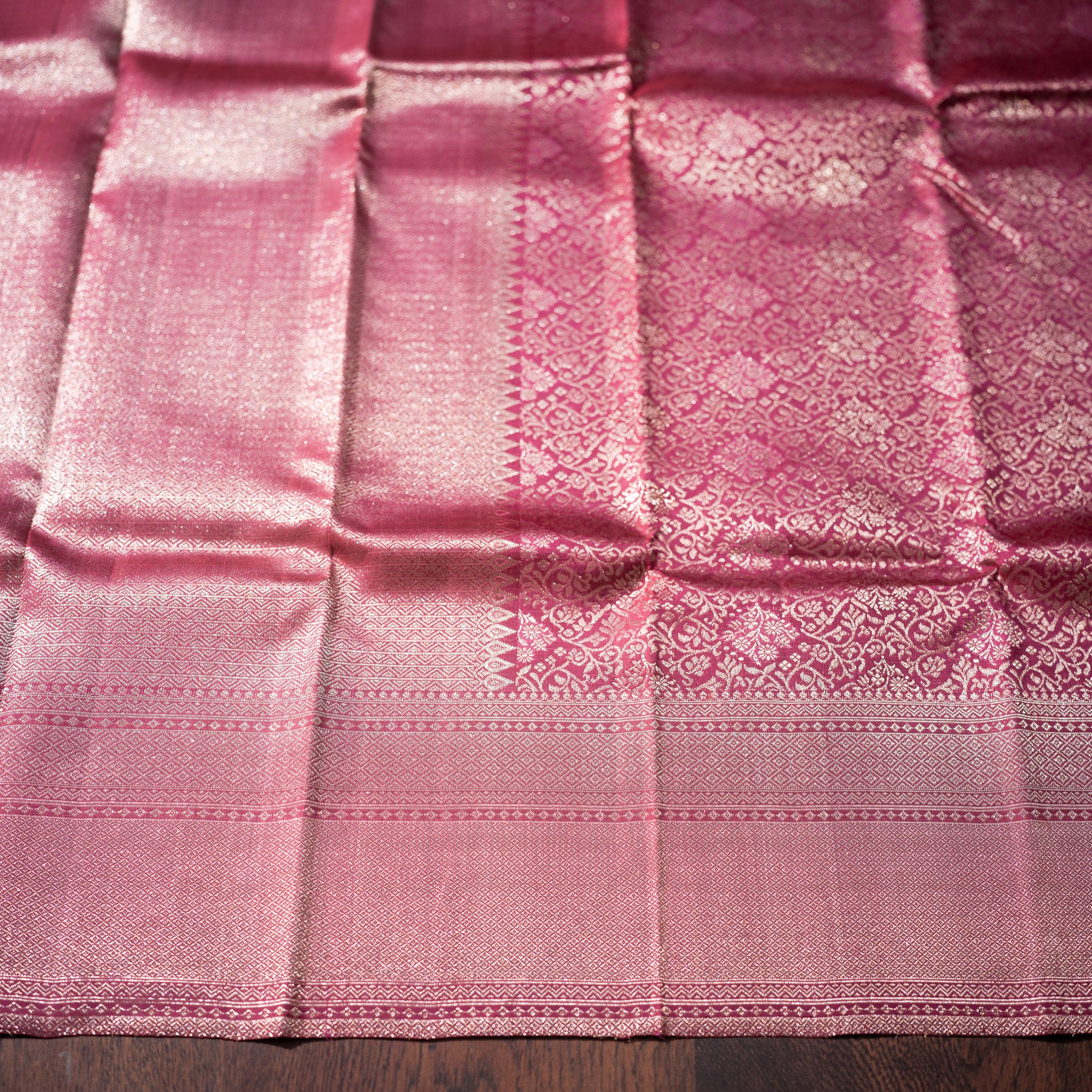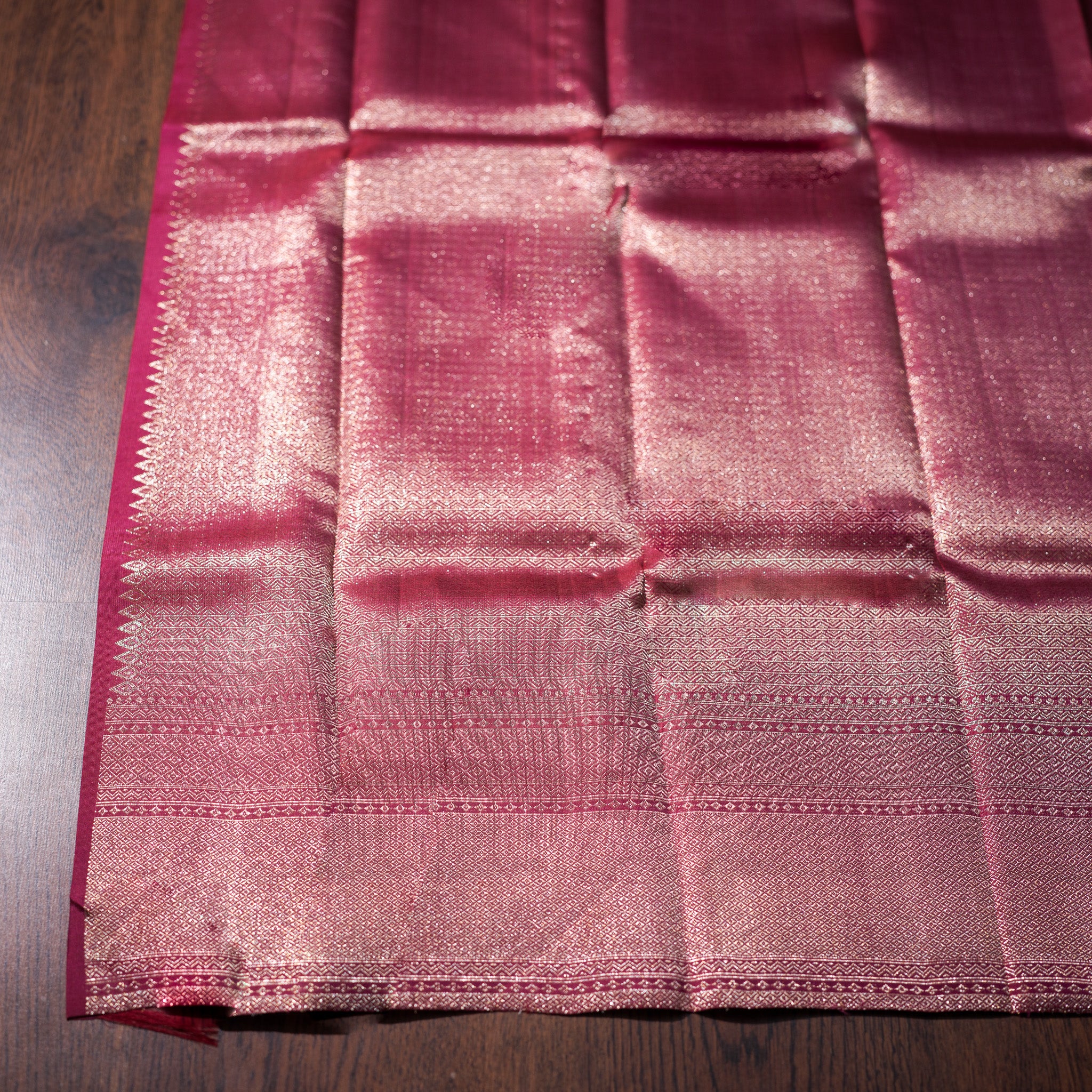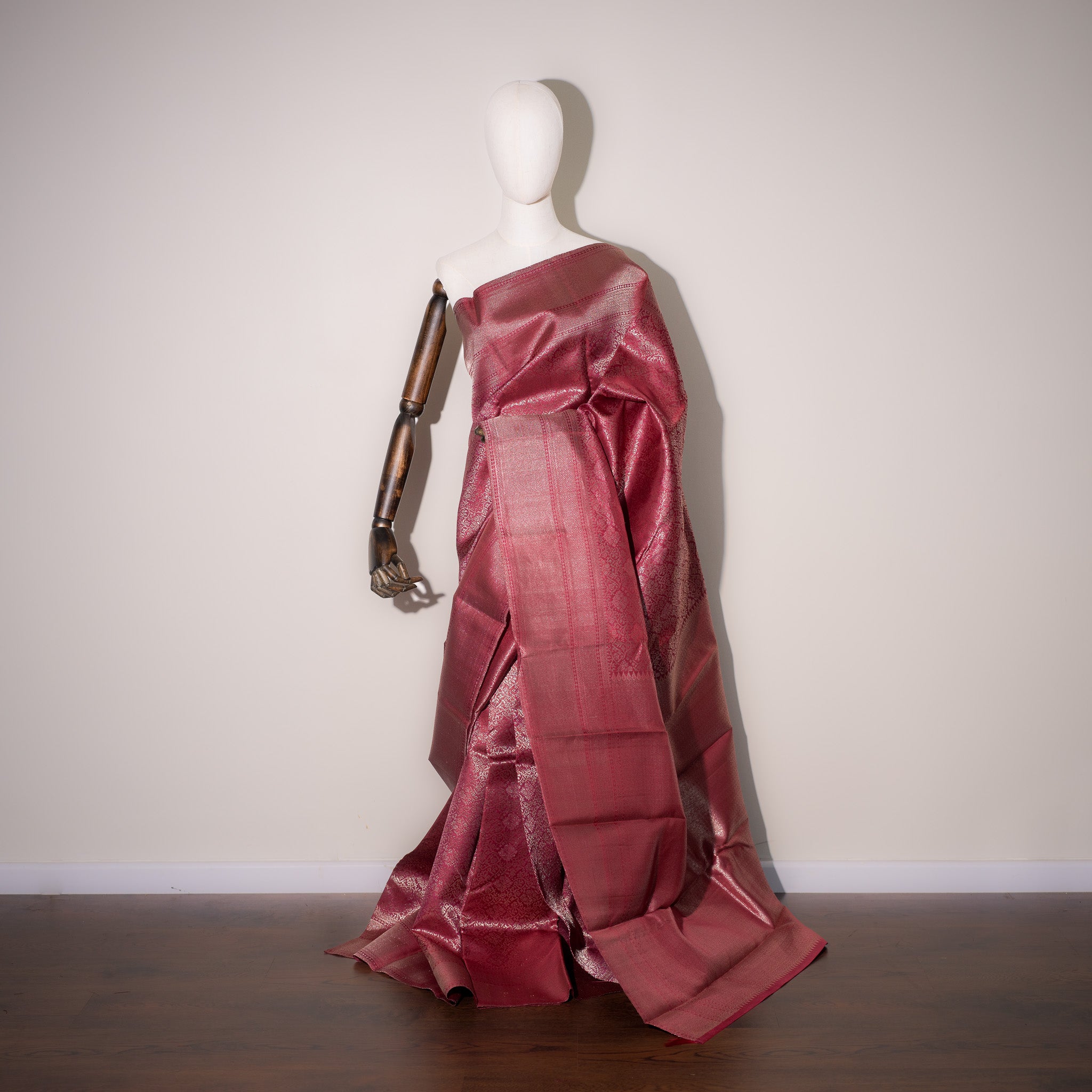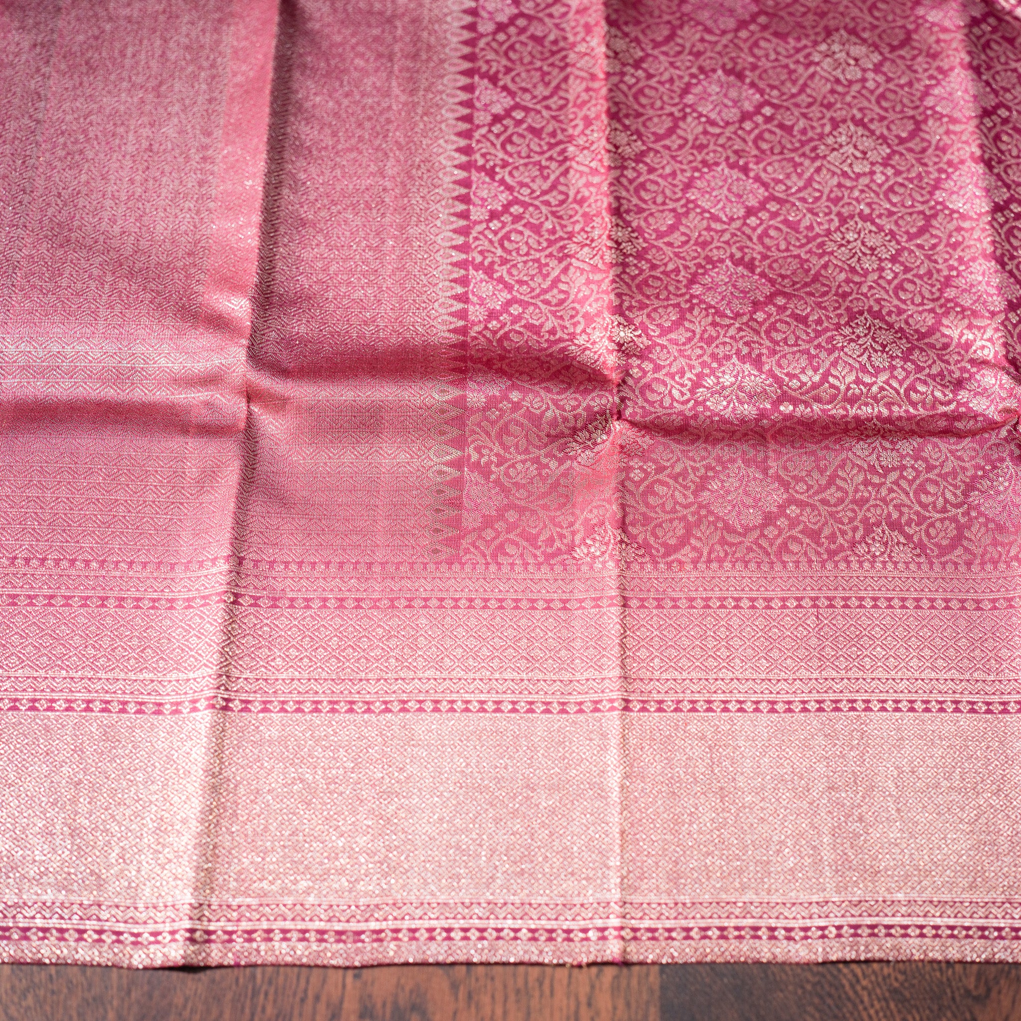 Timeless and graceful, this pure Kanjivaram silk saree from Kanchipuram captures the essence of classic South Indian wedding elegance. Draped in a soft yet striking rosewood pink hue, it radiates a warm glow with its finely woven self-zari detailing that enhances the silk’s natural lustre. The intricate border and pallu, crafted with meticulous precision, add depth and richness to the drape, making it a perfect choice for brides, side brides, and wedding guests seeking refined sophistication. This saree beautifully marries traditional craftsmanship with subtle opulence — a true heirloom piece for any celebration.